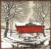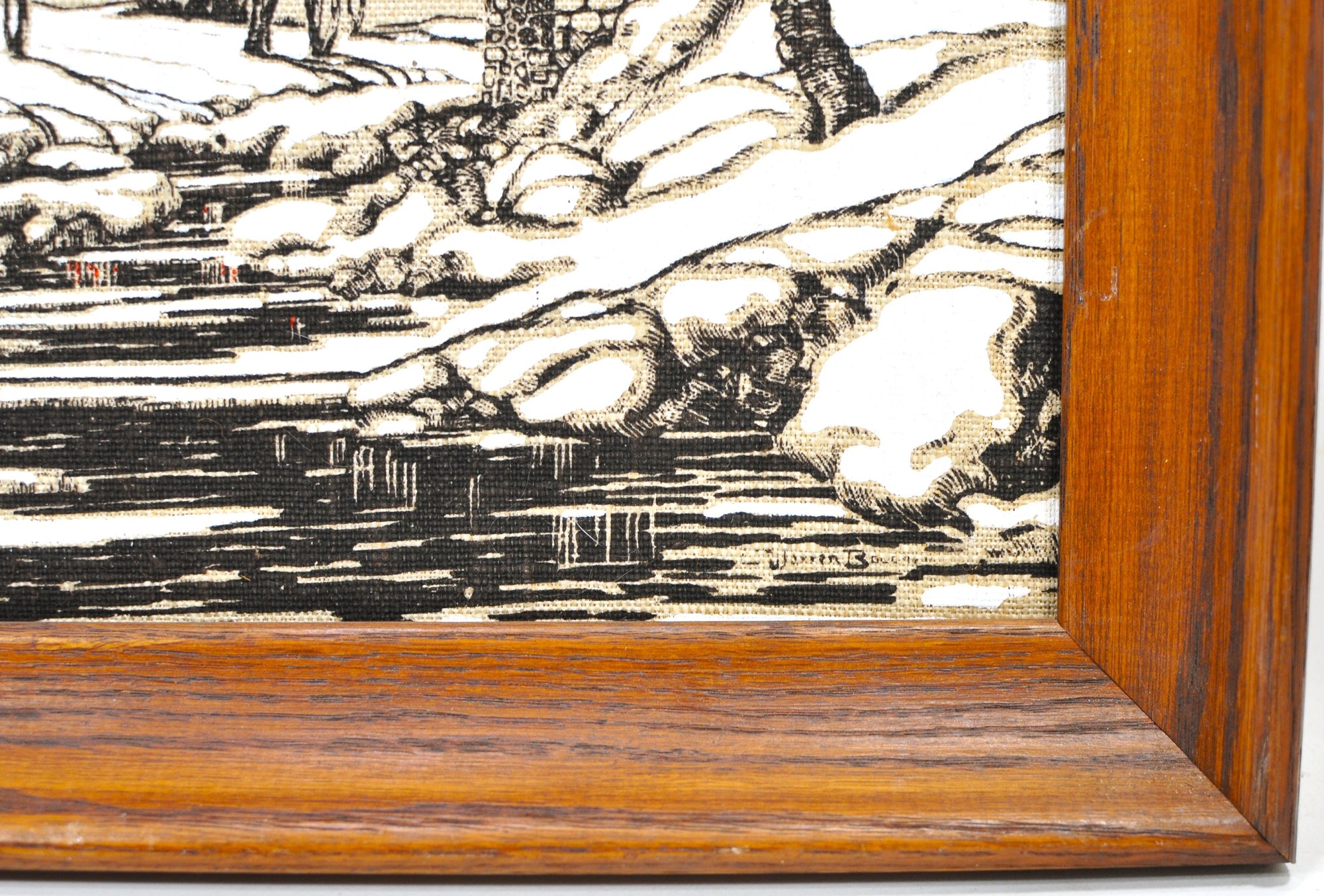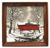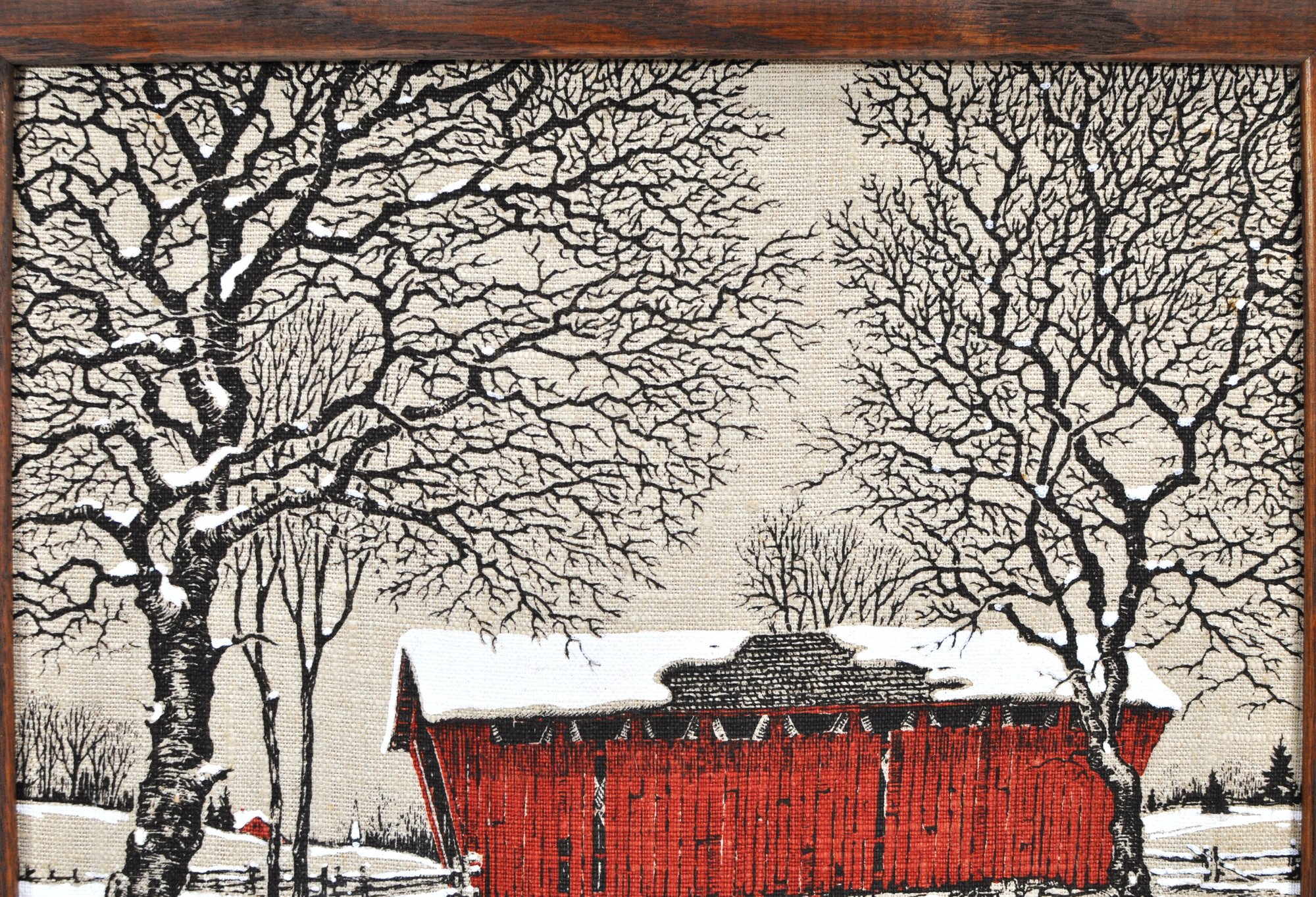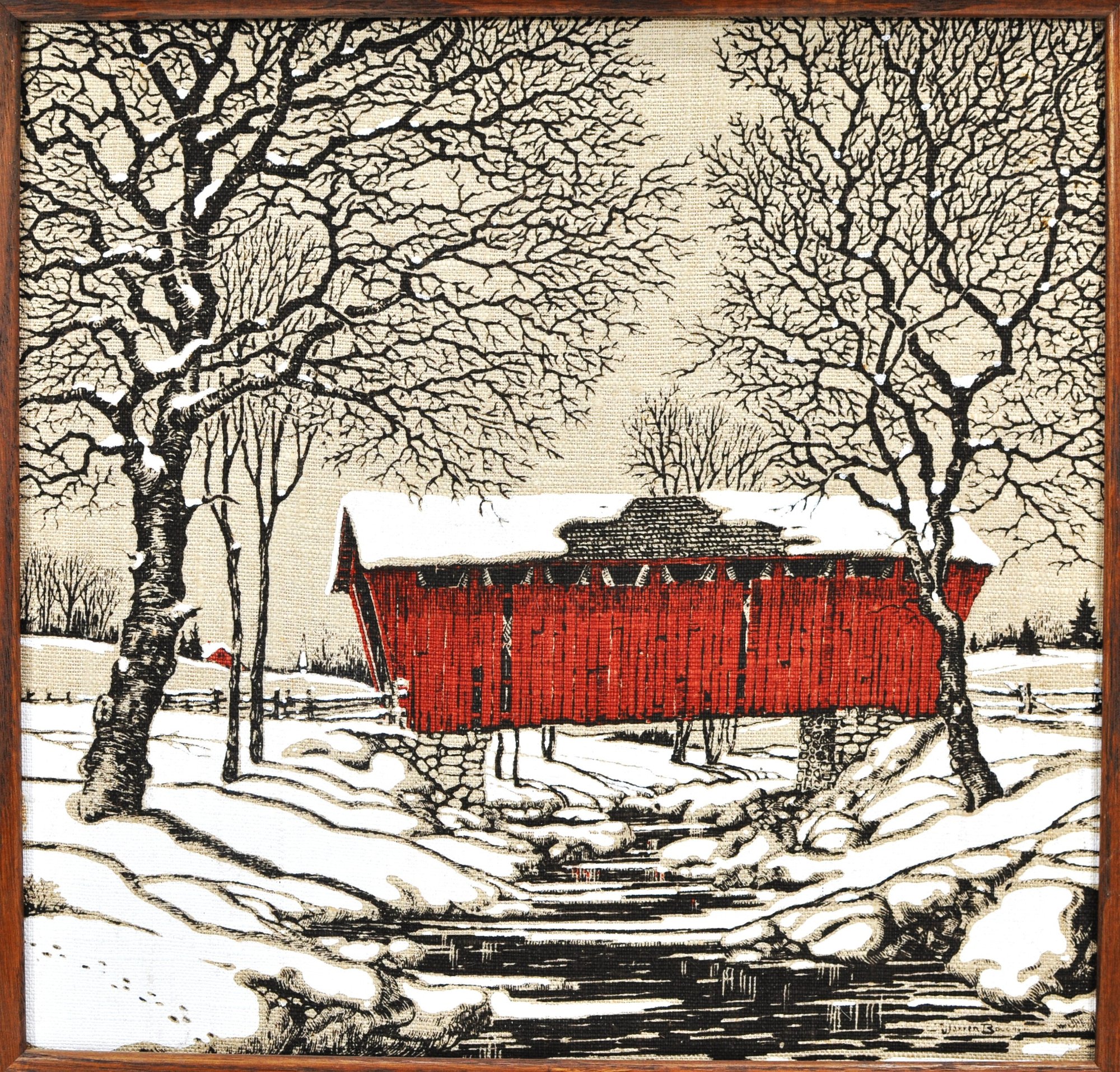 Vintage Kay Dee decorative linen wall art print featuring a winter covered bridge scene after a design by artist Warren Boucher. The composition shows a red covered bridge over a stream, set within a snowy landscape with finely detailed bare trees, rendered in black linework on natural linen with bold red accents.