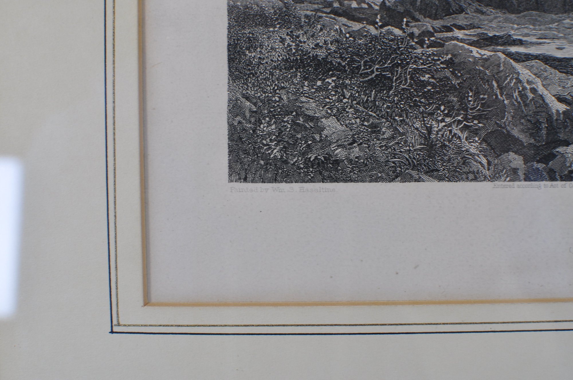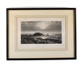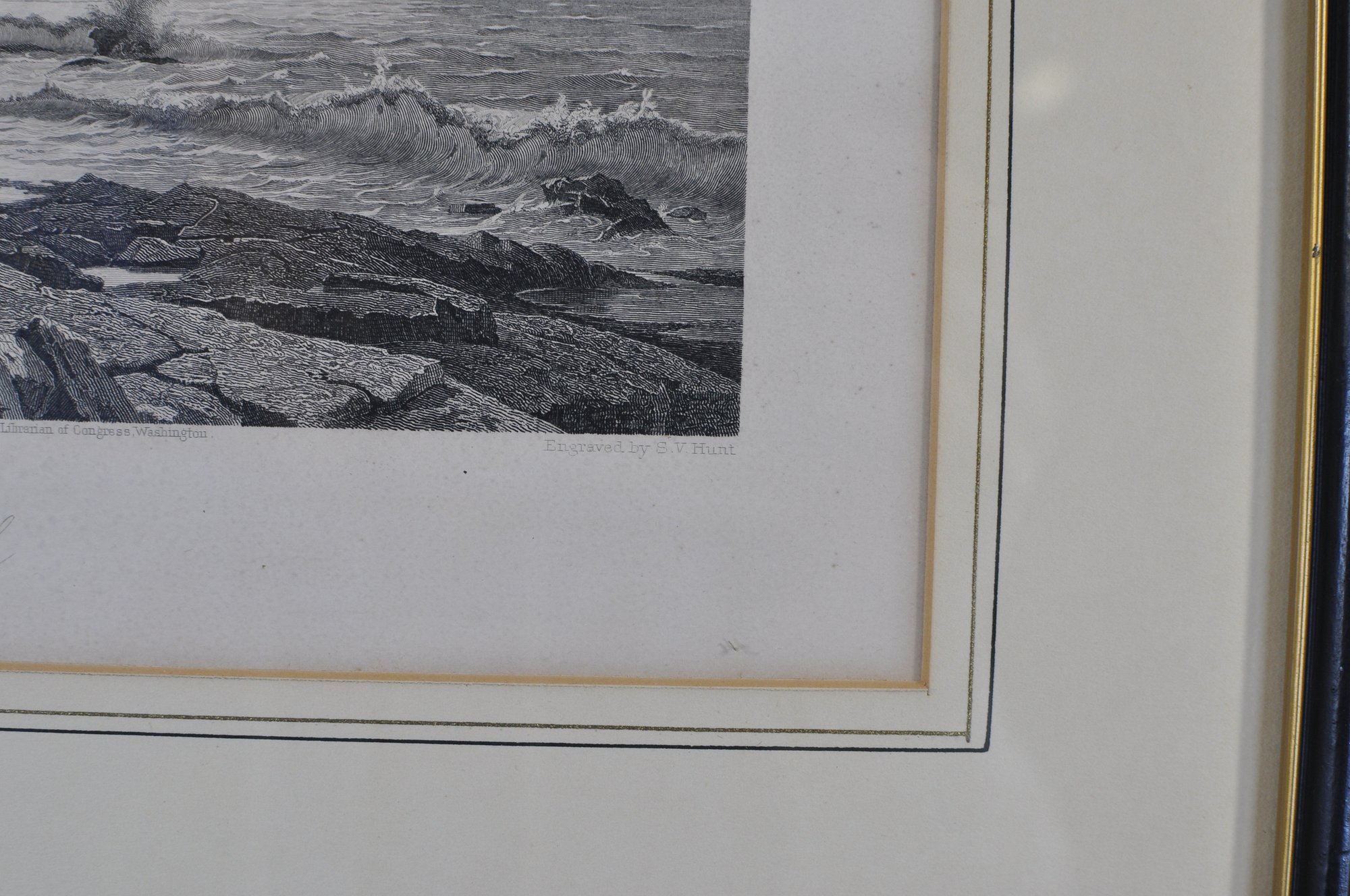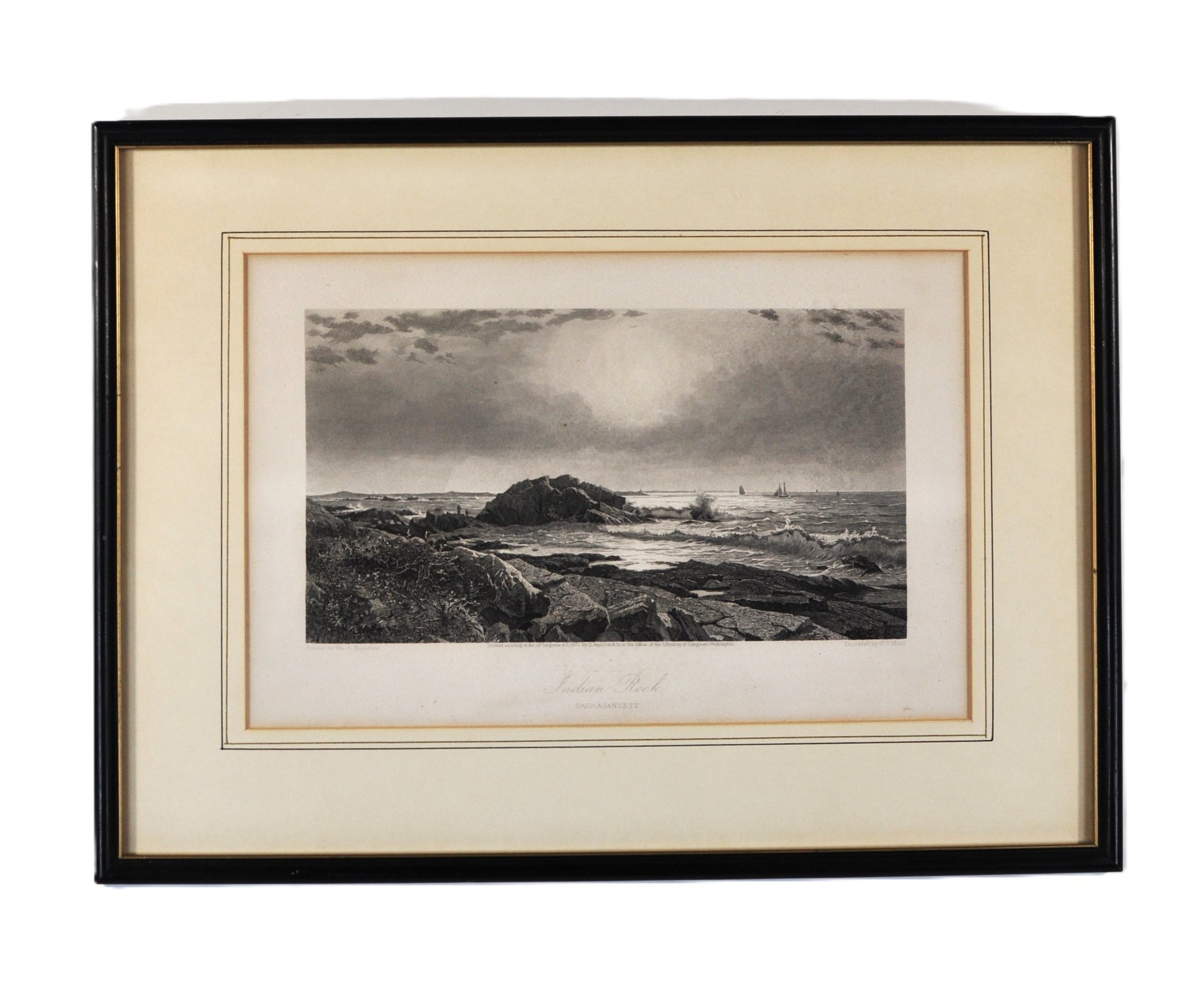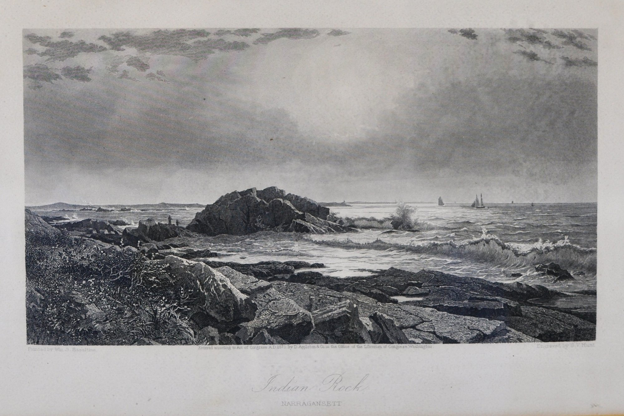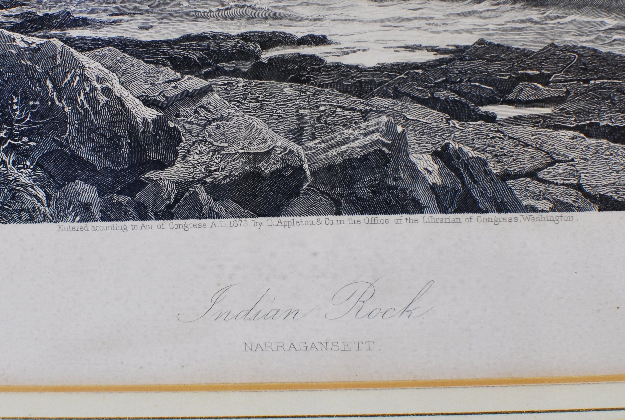 19th-century steel engraving titled Indian Rock, Narragansett, published in 1873 by D. Appleton & Co. after a painting by William Stanley Haseltine (1835–1900). The scene depicts the dramatic rocky shoreline of Narragansett, Rhode Island, with waves crashing against granite outcrops and sailing vessels visible offshore. Framed under glass.