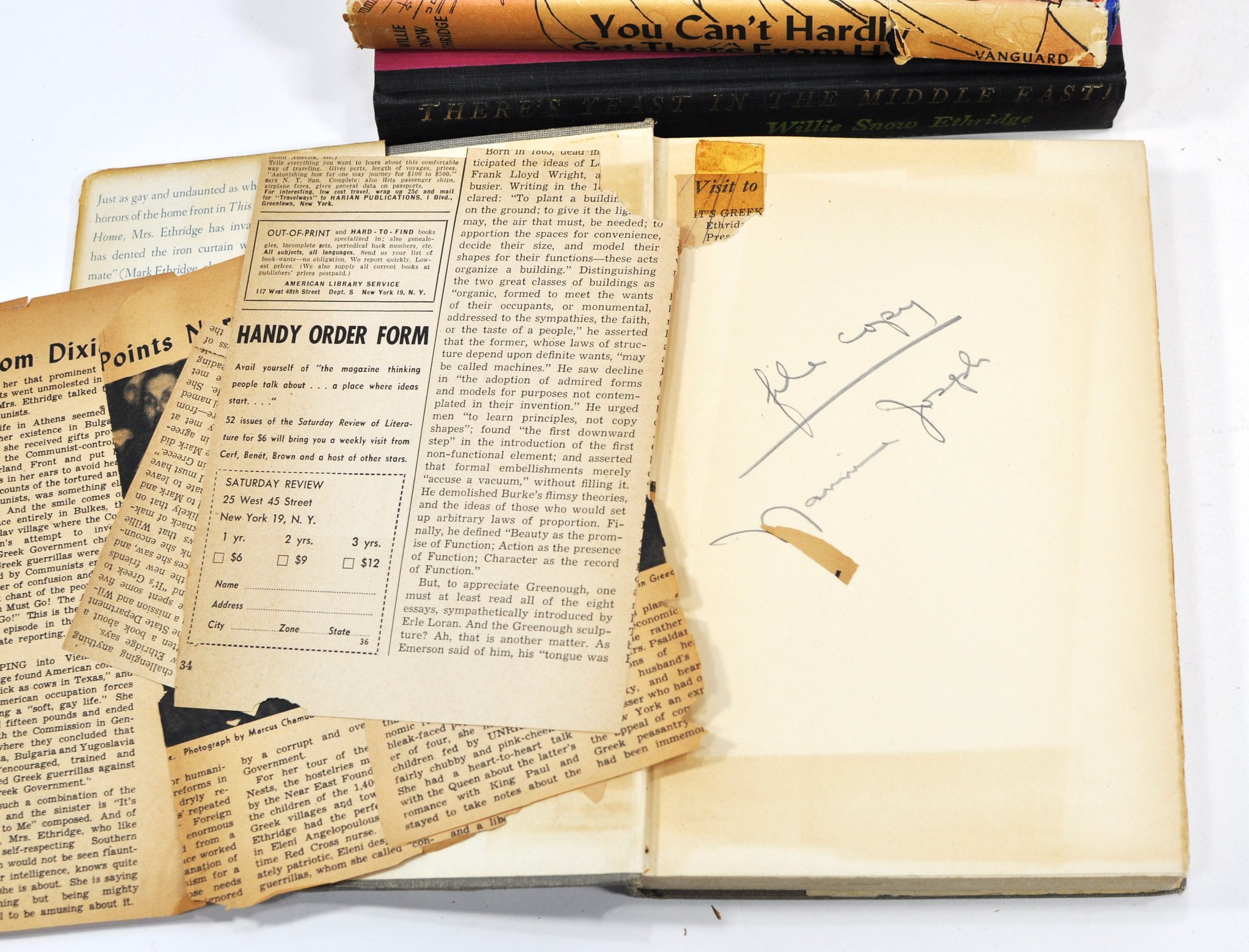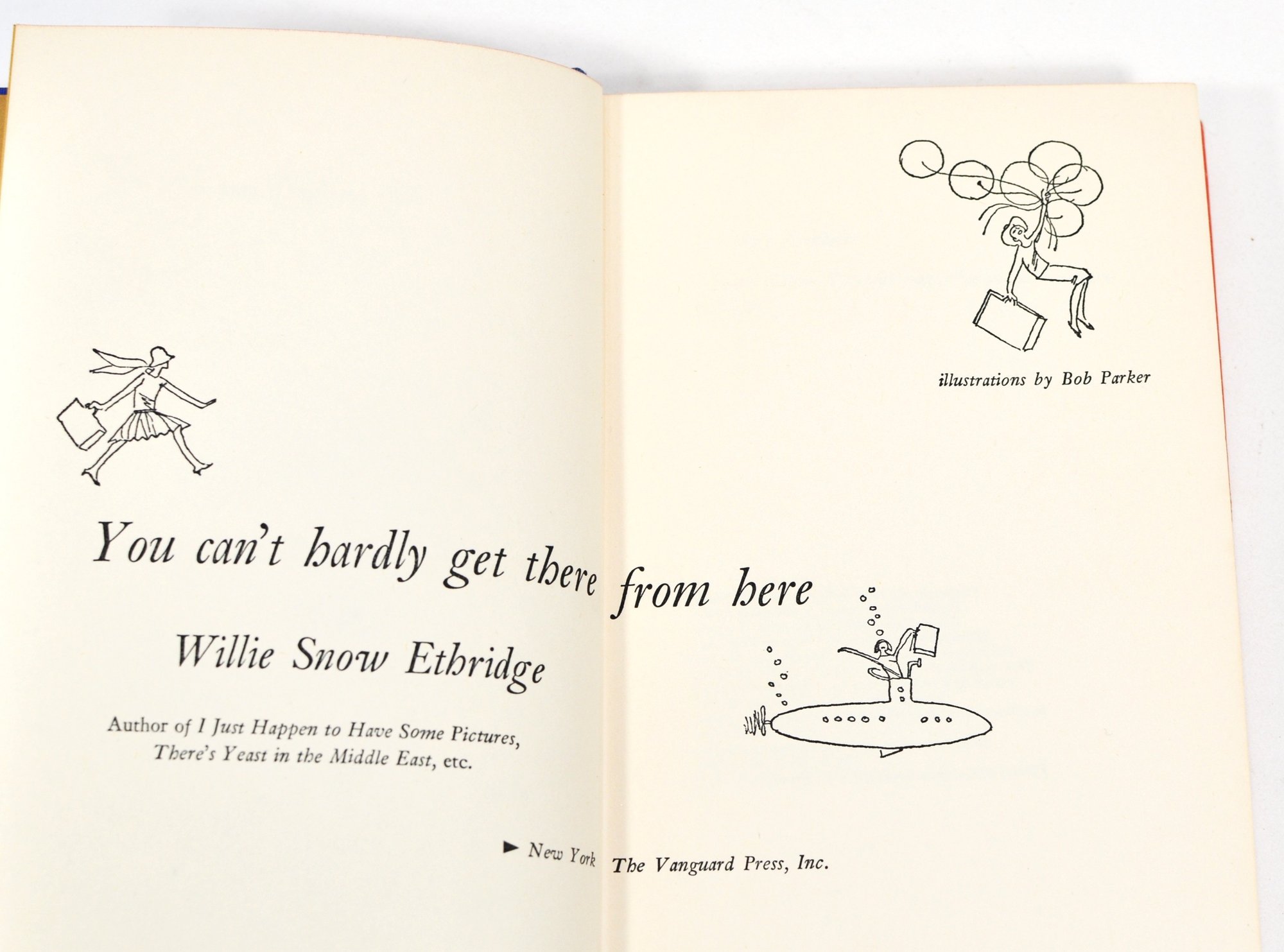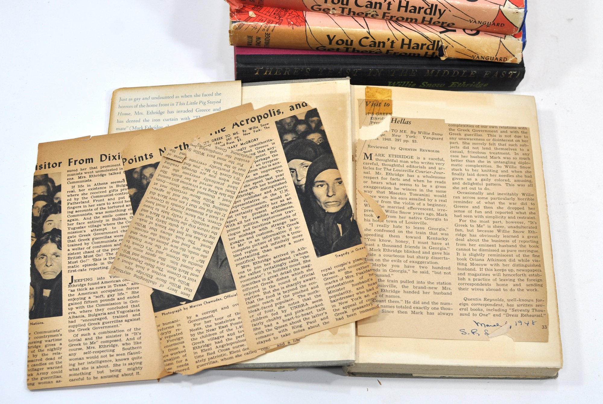 Group of Willie Snow Ethridge titles including You Can’t Hardly Get There From Here (2 copies, illustrated by Bob Parker), It’s Greek to Me, and There’s Yeast in the Middle East. Mid-20th century Vanguard Press editions, one copy inscribed by the author. Illustrated throughout.
