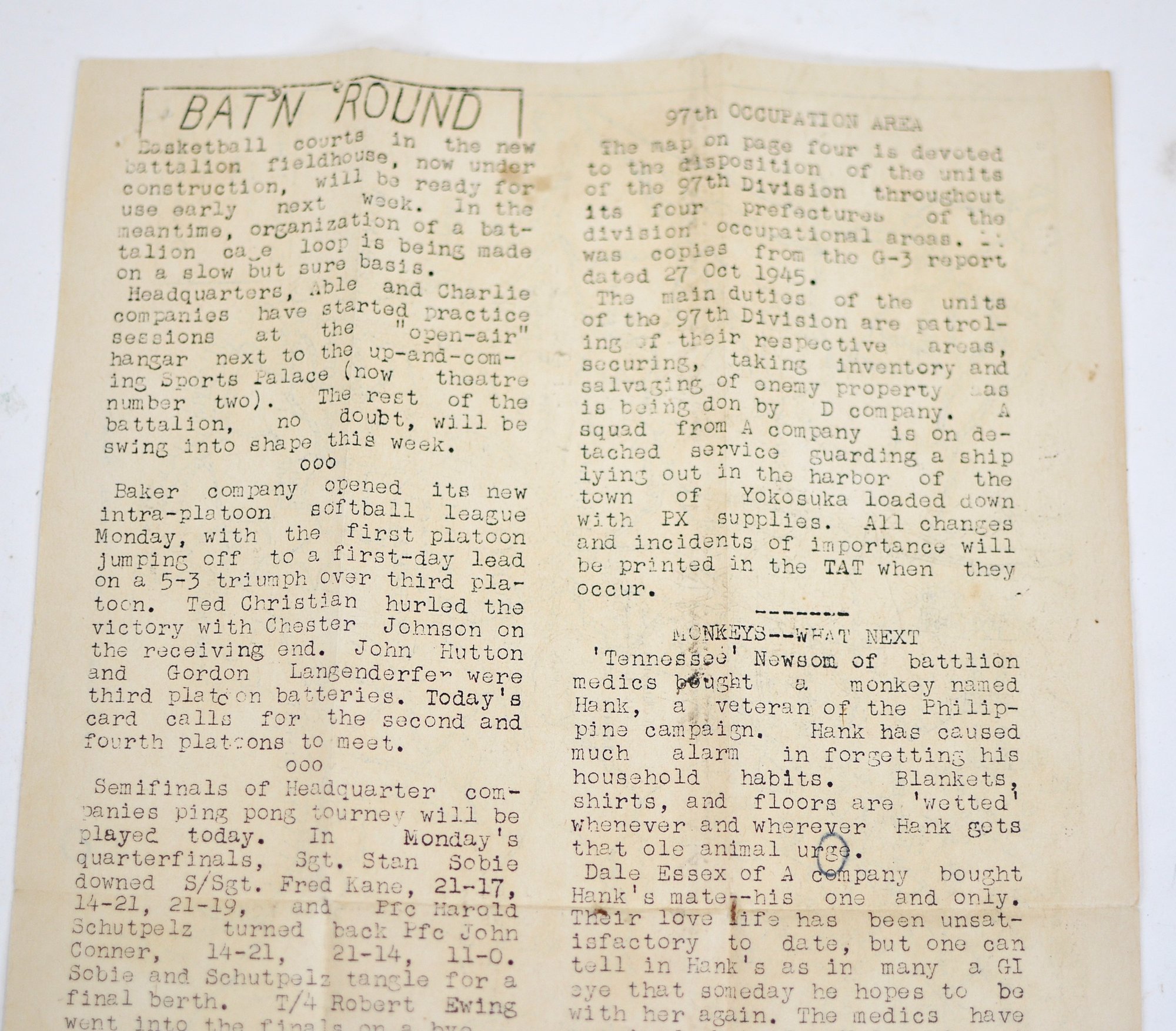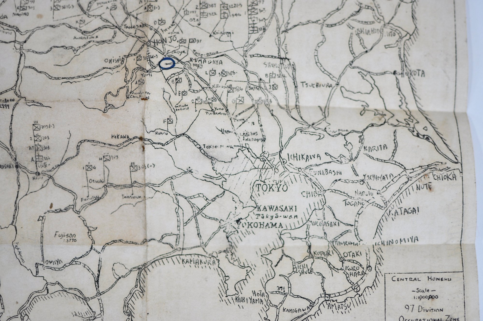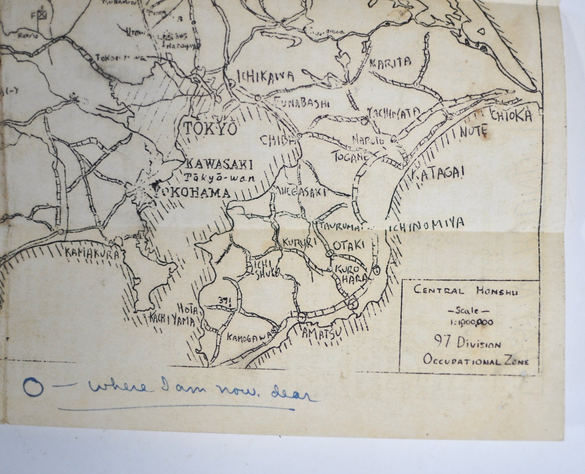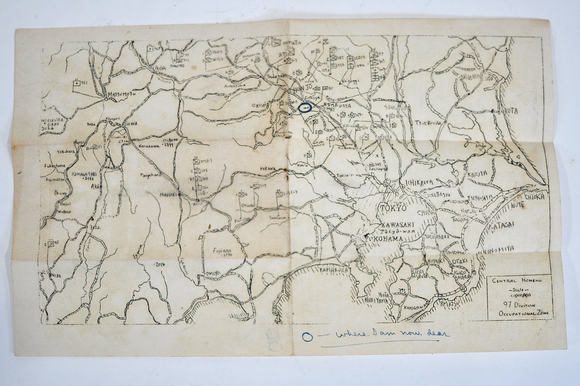 Original WWII-era paper ephemera associated with the 97th Division Occupation Area in Japan, dated October 1945. One side features a typed battalion newsletter with period reporting and commentary, while the opposite side shows a hand-drawn map of central Honshu (Tokyo–Yokohama region), including a circled location annotated in ink (“where I am now, dear”), adding a strong personal, firsthand element.