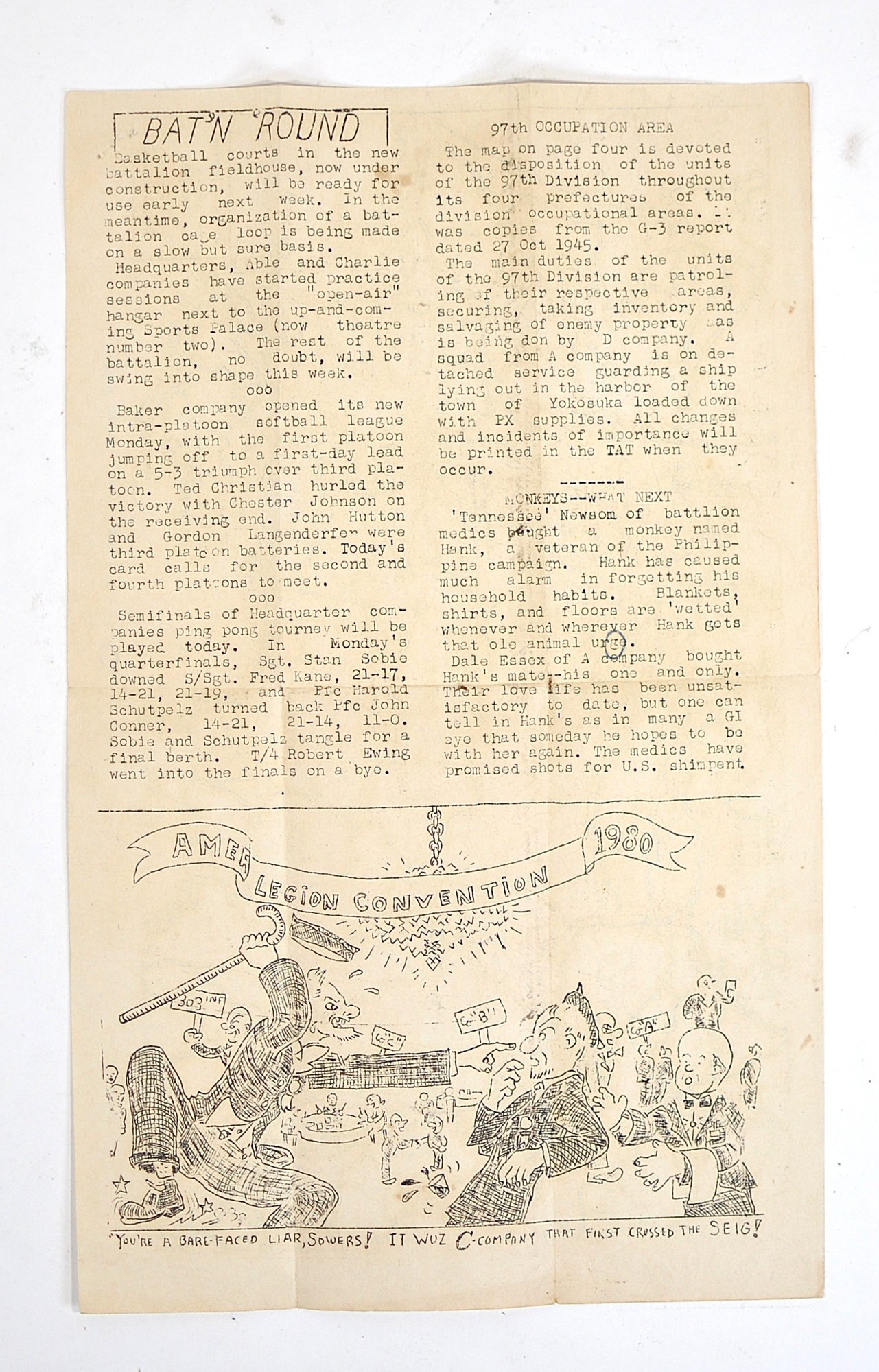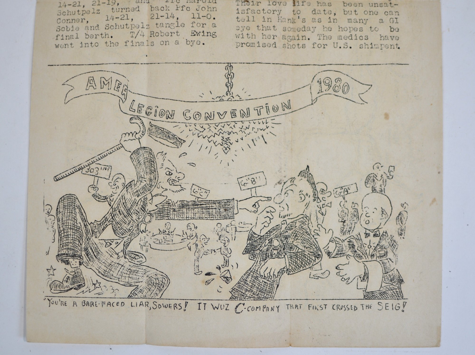 Notably, the same sheet was later reused decades afterward: the reverse also bears an American Legion Convention cartoon dated 1980, indicating the original wartime paper was retained and repurposed rather than representing a contemporary WWII date. This kind of practical reuse is commonly encountered in veteran-kept materials.