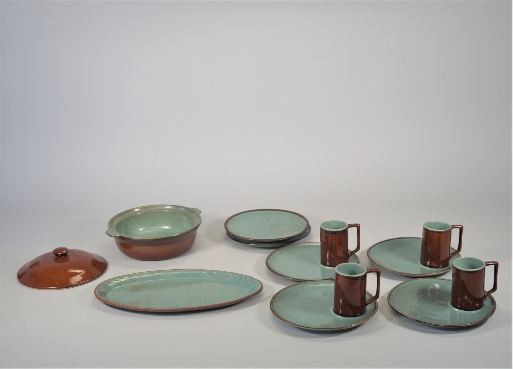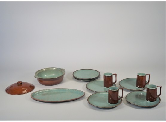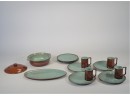 Brown and sage green glazed stoneware. 6 Snack plates, 4 cups, 1 casserole dish with lid and 1 serving plate. In great used condition.