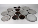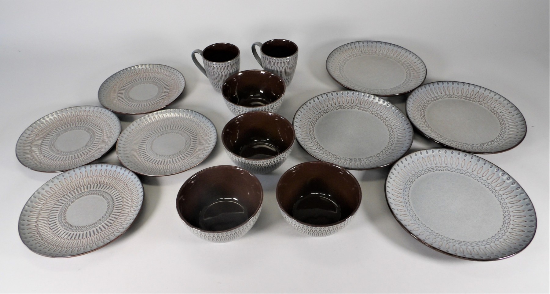 Listed are 4 dinner plates 10.5"dia, 4 salad plates 8.5"dia, 4 bowls 6"dia and 2 mugs 4.5"tall. There is a chip on one of the bowls. The colors and pattern of this Mikasa dishware set are quite attractive and in very good condition. See photos for details.