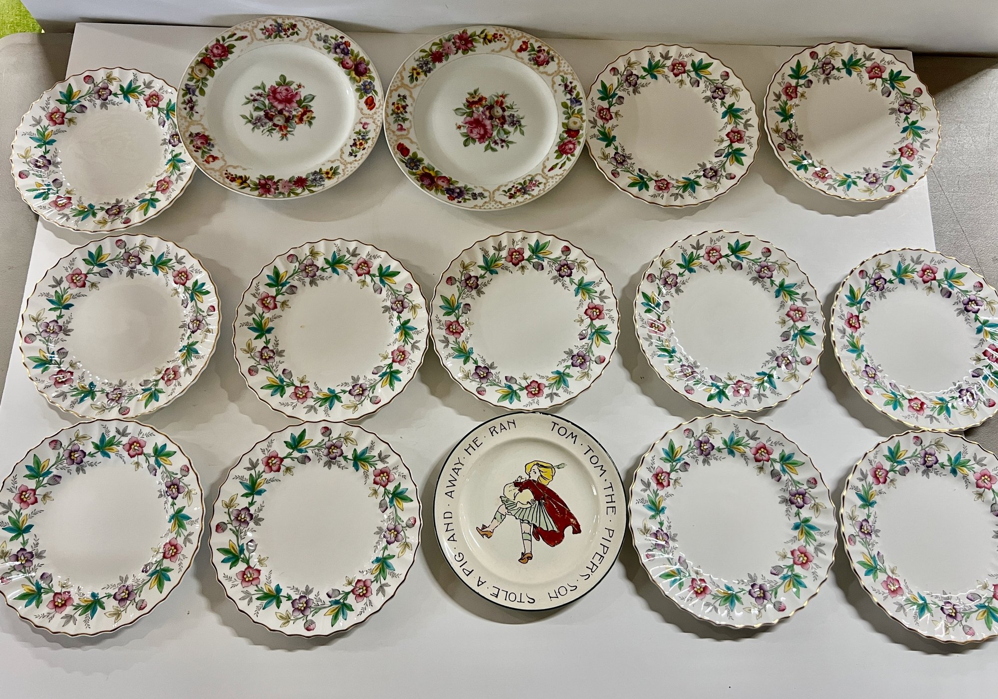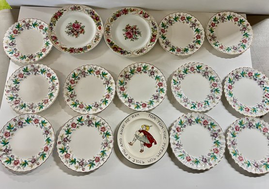 Collection of 15 vintage plates, featuring a floral design and one with a central illustration of a girl running away with a pig. The plates are approximately 6-7 inches in diameter.