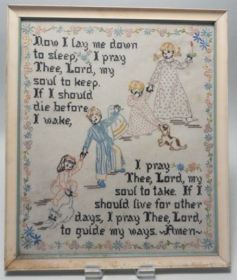 Vintage 1947 hand embroidery of "Now I Lay Me Down To Sleep" prayer and sleepy children climbing the stairs