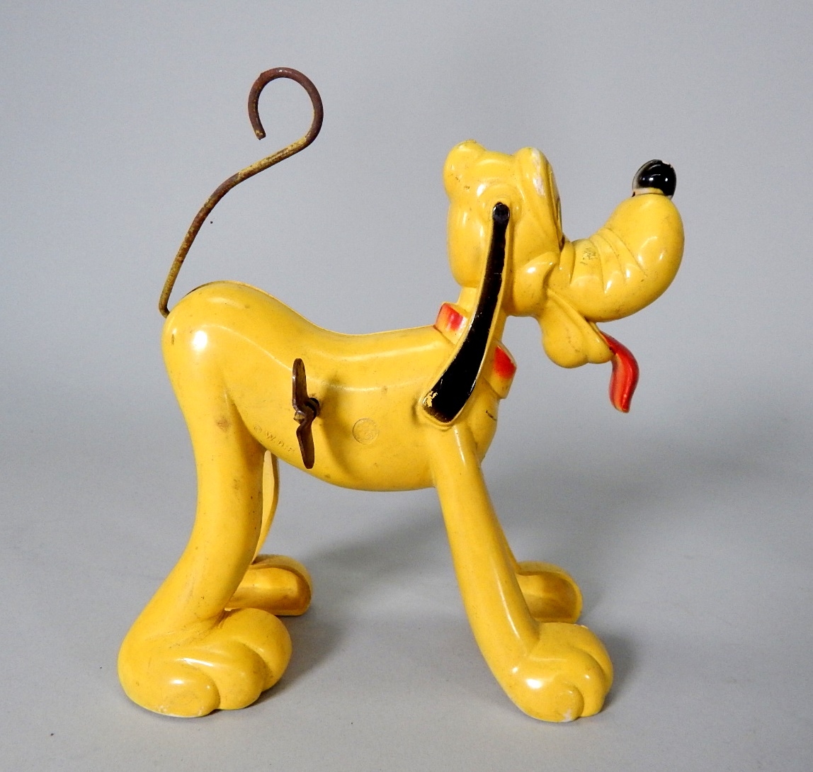Wind-up Toy by Marx and Walt Disney Productions from the 1950's in the form of Pluto and his TWILLY Tail that spins when wound to the Market place. This toy measures 6 3/4" inches in length and 5 1/2" inches in height.