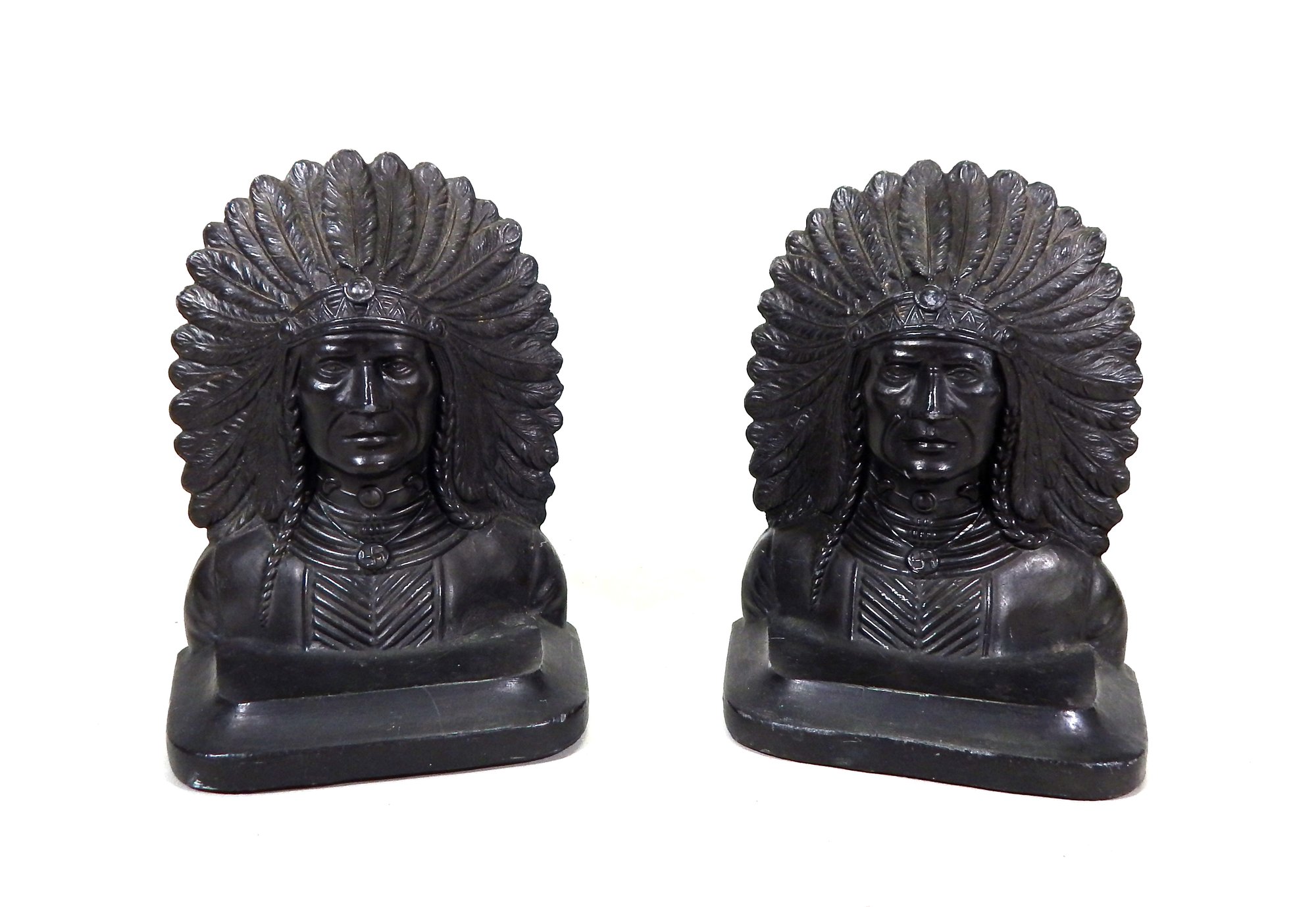 Vintage white metal Native American bookends Cole Mfg Co Lindsay Ontario.