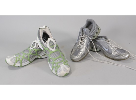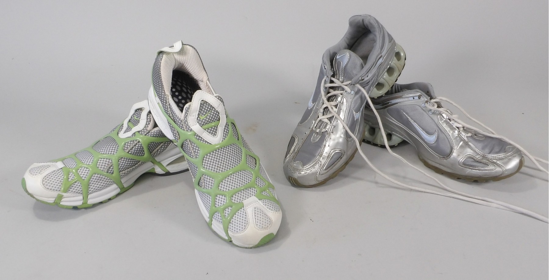 Nike 2000 Air Kukini 105206-131. Designed by Eric Avar. Nylon and mesh paneled upper. White botanica, neutral grey. Right shoe has 1 piece of broken gel.