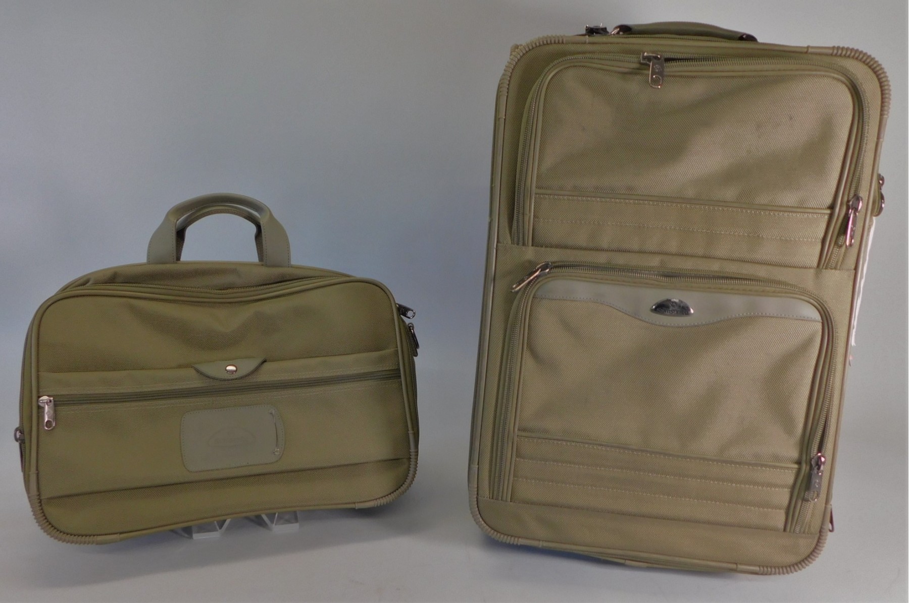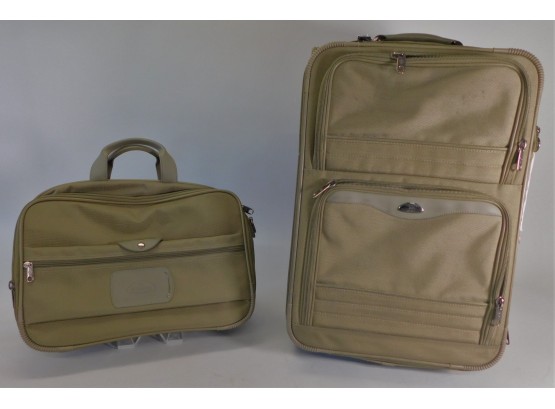 Sage green 24 x 16" large piece with wheels and pull handle. All zippers are working. Lots of compartments. Some wear on the outside. No rips. Smaller piece is 19 x 12". Good size for a carry on. Strap included.