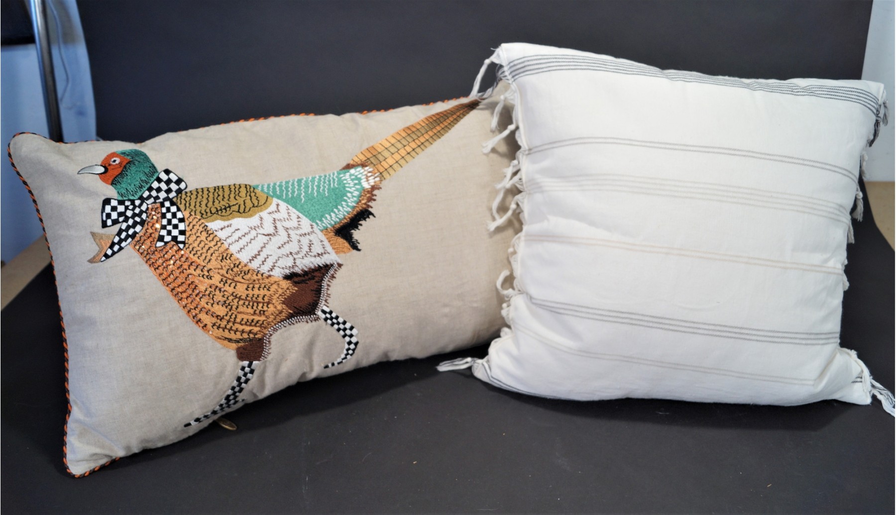 - one rectangular linen pillow with a colorful pheasant 24"l x 14"w from MacKenzie-Childs. Condition is very good.
