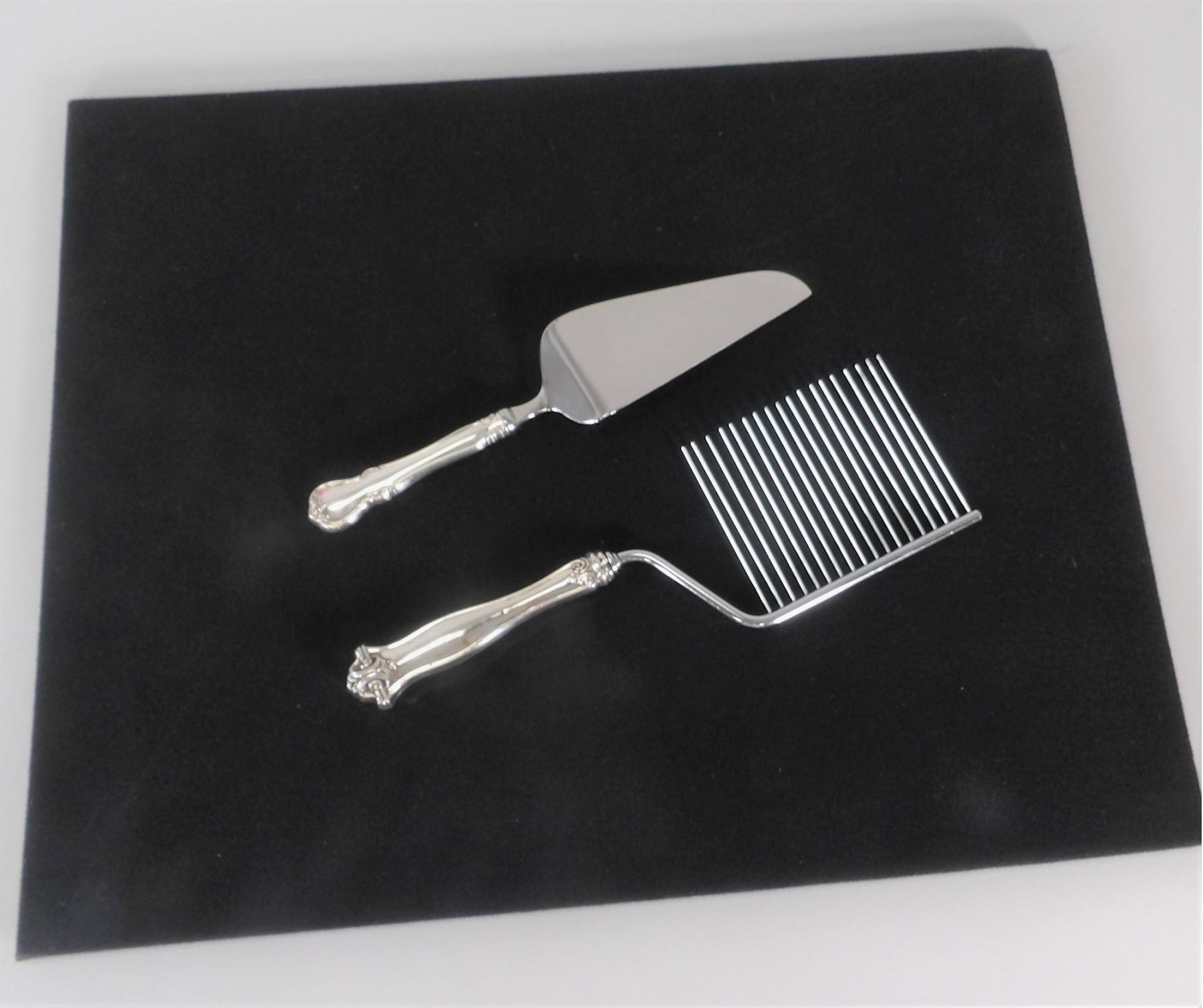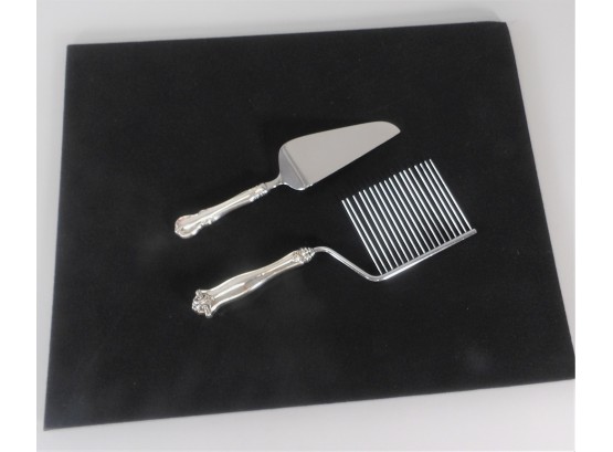 Listed is a Towle flat cake knife with a sterling handle, 10.5" in length. Also listed is a multi-pronged cake knife 11.5" long. Both knives are in very good used condition. See photos for details.