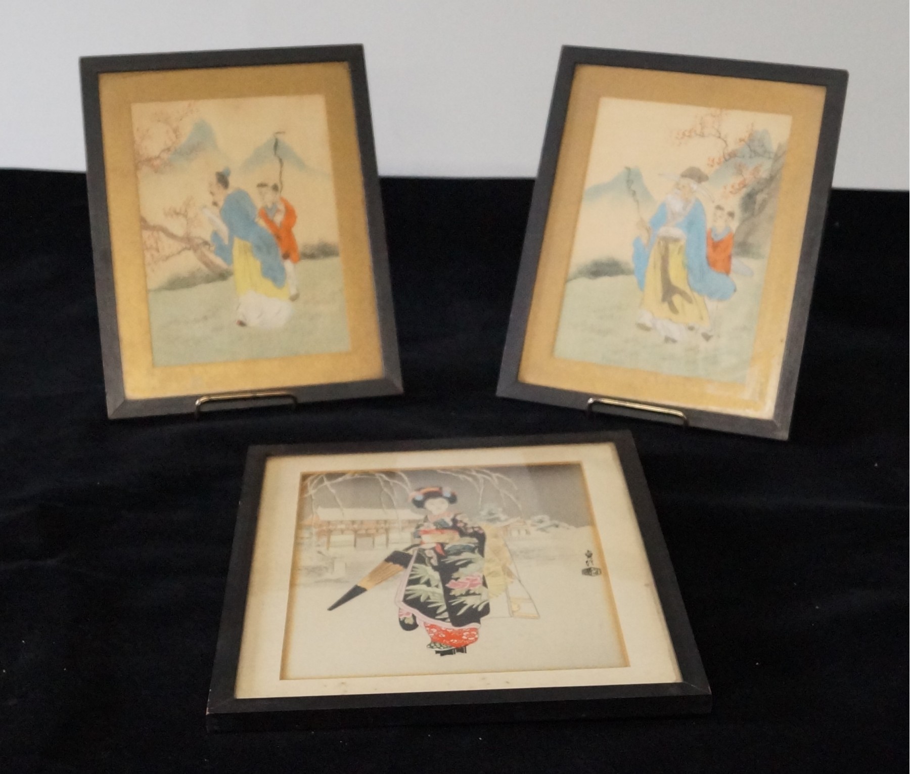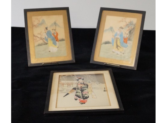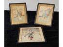 3 Woodblock Prints. The 2 smaller Prints are done on fabric. Measures 8 1/4" x 10 1/2".