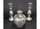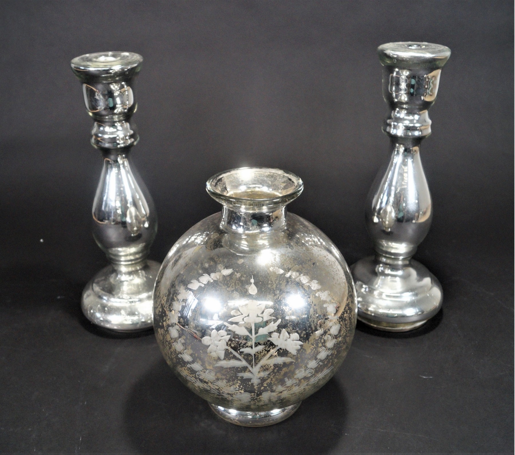 Listed are 2 candle sticks 13.5"h x 3.5"w and 1 vase 10.5"h x 3.5" at opening. All items are made of mercury glass and made in India. Condition is good. See photos for details.