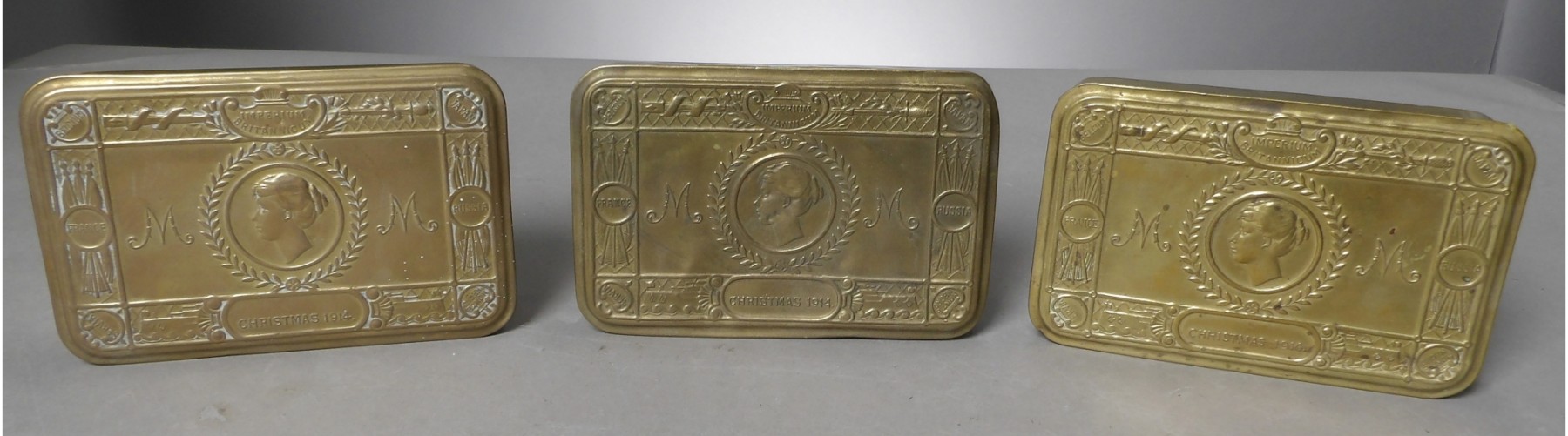 Relics of WWI. Tins were sent to the troops serving in the trenches. May have contained sweets, cigarettes, a pencil, along with a photograph of Princess Mary and a card.