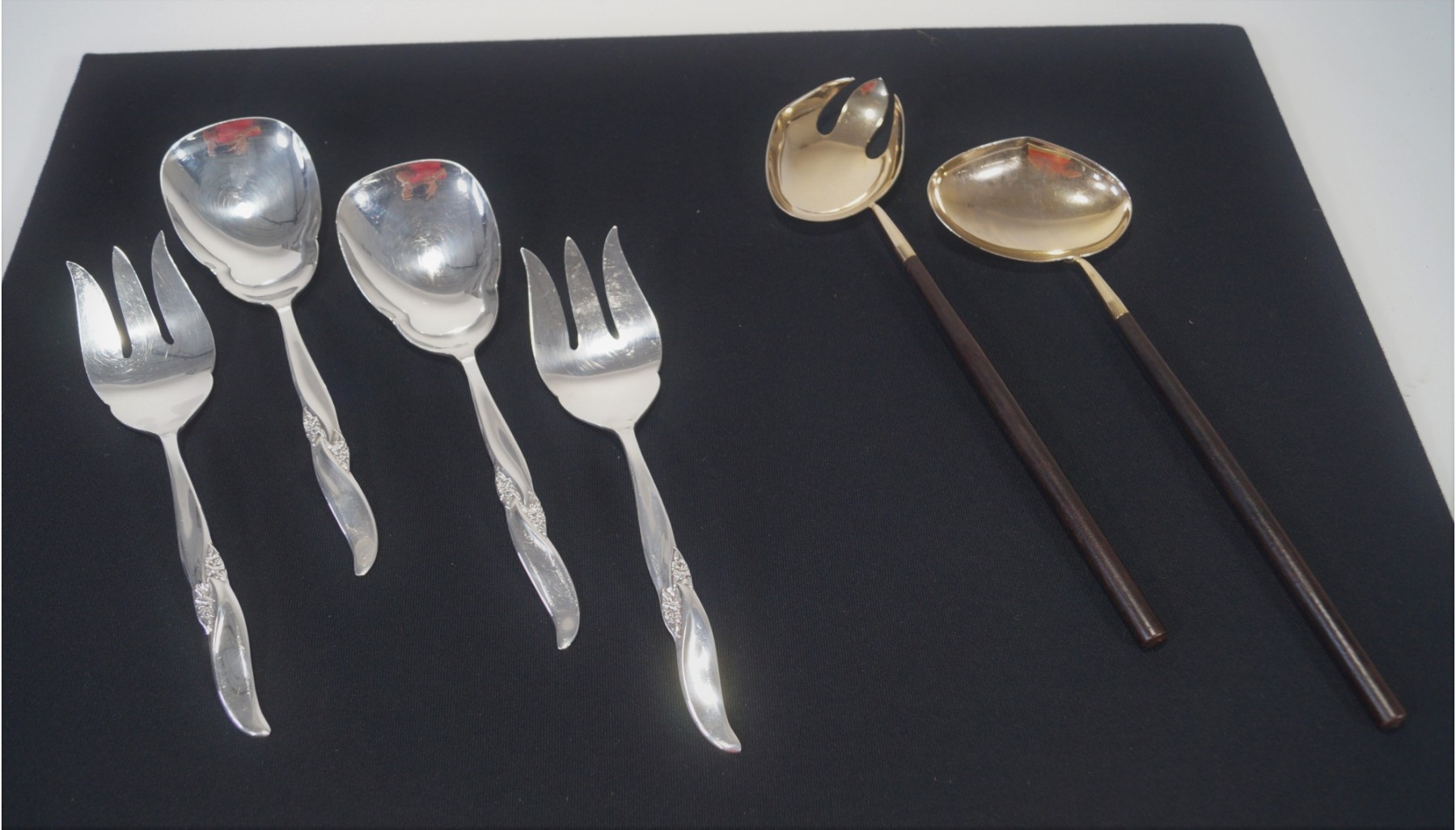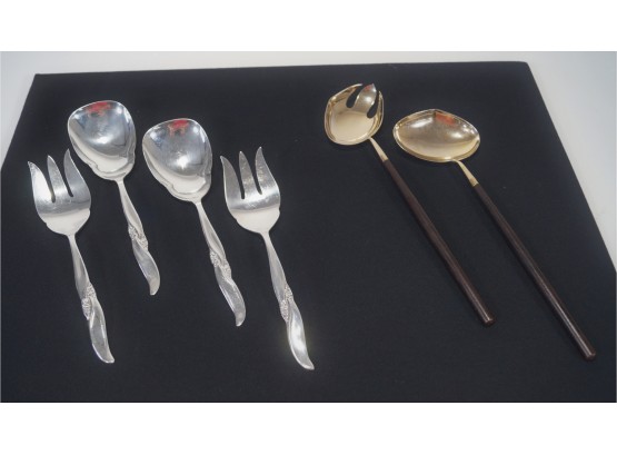 Listed are 2 sets of International Silver spoon & fork salad servers 9.5"; and 1 set of Napier MCM gold wash servers with wood handles 12". These 6 pieces are in very good used condition.