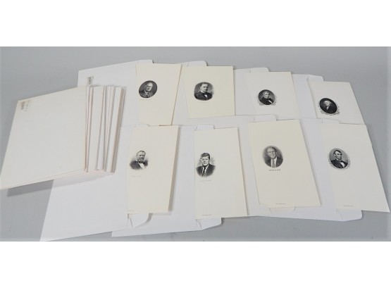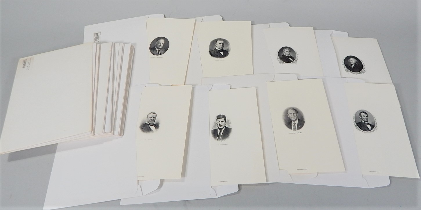 Listed is set of 38 engraved presidential portraits by Bureau of Engraving and Printing. The richly detailed images are steel engraved on heavy 8” x 6” ecru card stock and are in their original envelopes. One envelope has some damage. The portraits vary from 2-3” x 2-3”. Many of the early presidents are depicted in an oval with surrounding floral garland. The name of the President is on each engraving. Missing are Washington, Ford and Carter. In very good condition. See photos for details.