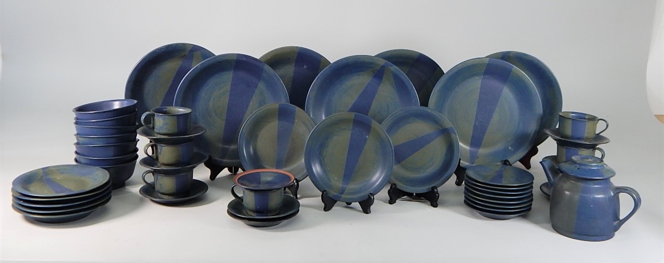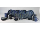 Blue and green stoneware dish set. in used condition - has some minor paint chips. Made in Taiwan.