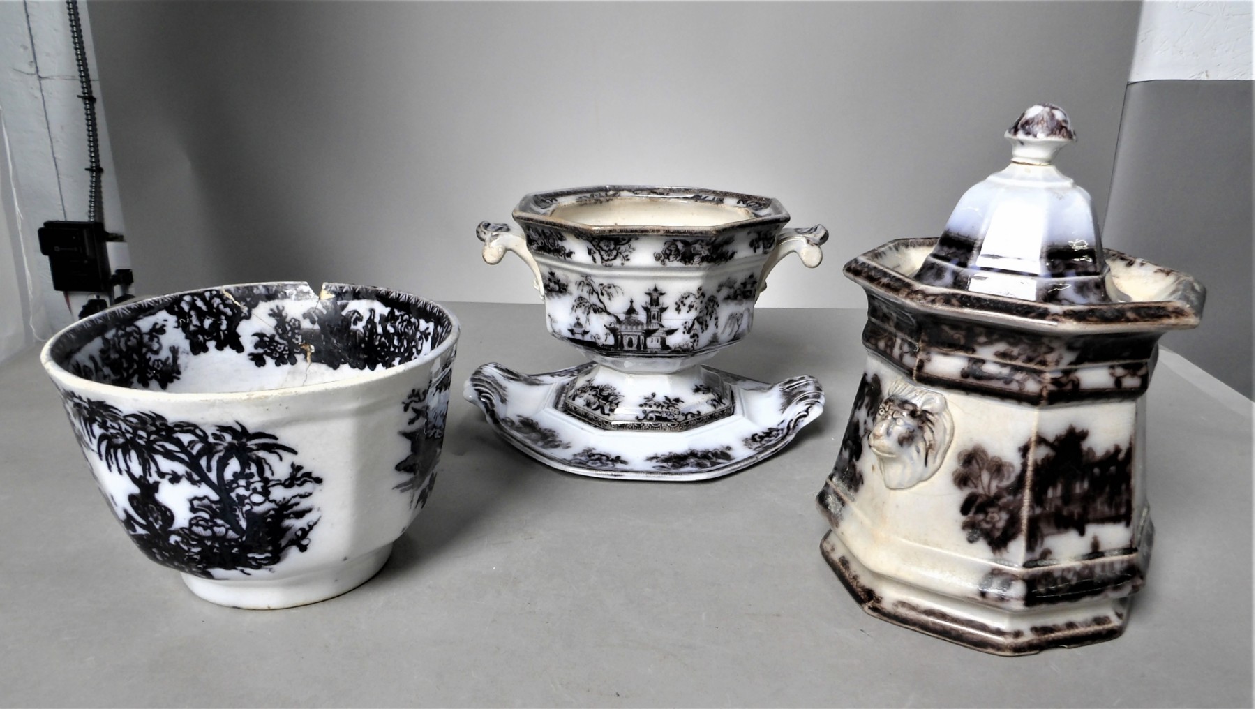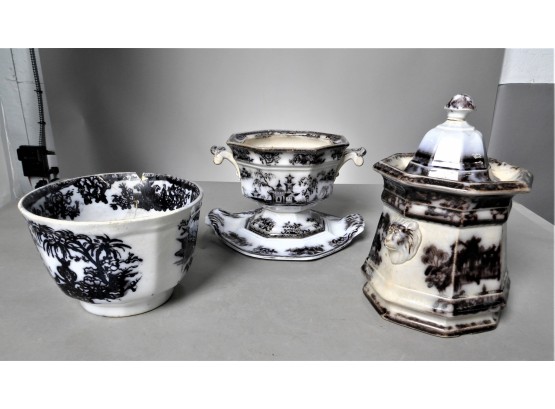 Listed is an open bowl 7.5"w x 4.5"h, sitting on a platter 8"w and stamped on the bottom E & C Challinor, Ironstone and what looks to read "Pelew". There is a chip on the rim above one of the handles. The platter is in very good condition. Also listed is an unmarked bowl with a number of cracks and chips 6" x 4". Also listed is an unmarked bowl with 2 lion heads and cover (repaired) - not sure they match. There is a chip on the bottom of the bowl and on the lid. See photos for details.