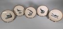 5 bird prints mounted on board with fabric frame - 7.75"dia.