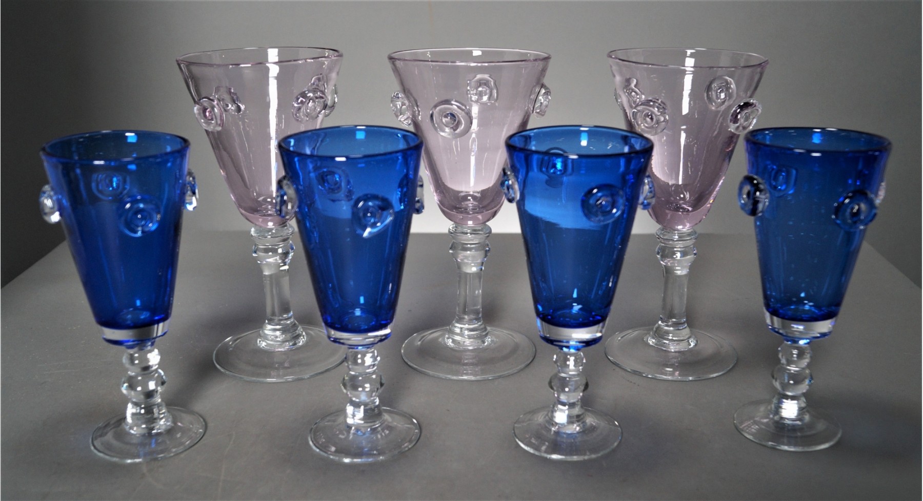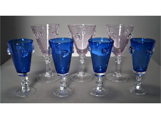 Listed are 7 hand blown glasses: 3 are pink & 8"tall; 4 are blue & 7"tall. Each is decorated with swirls. They have a nice, firm weight to them and are in very good condition. See photos for details.