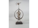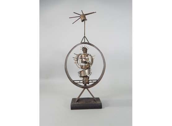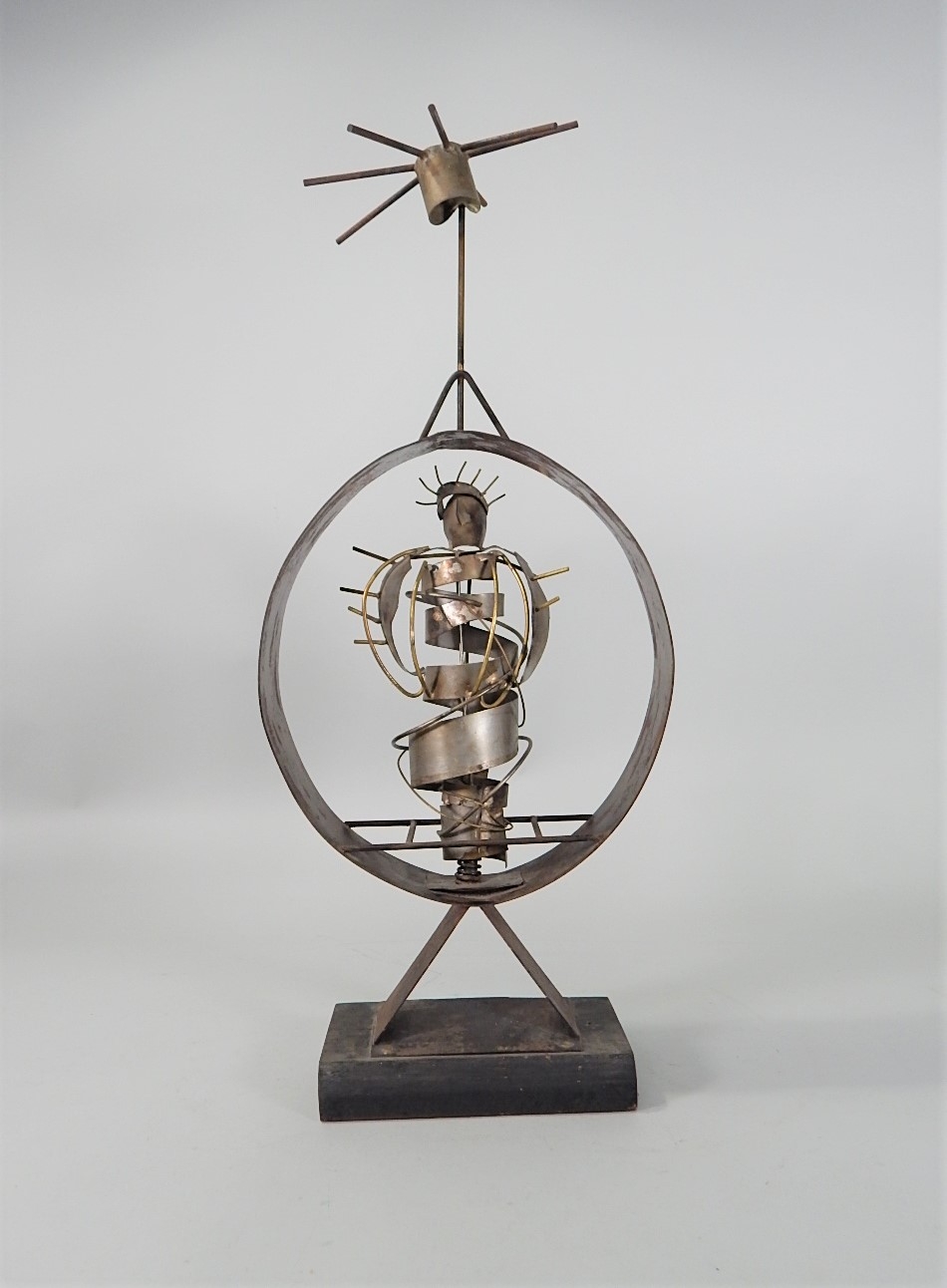 Listed is a kinetic metal sculpture. It is unsigned so the artist is unknown. The central figure is mounted on a spring so it moves from side to side and back and forth when touched. It measures 27"h x 11.75"wide. Base measures 9"w x 5"d. In very good vintage condition, it has acquired an attractive patina with age.