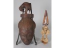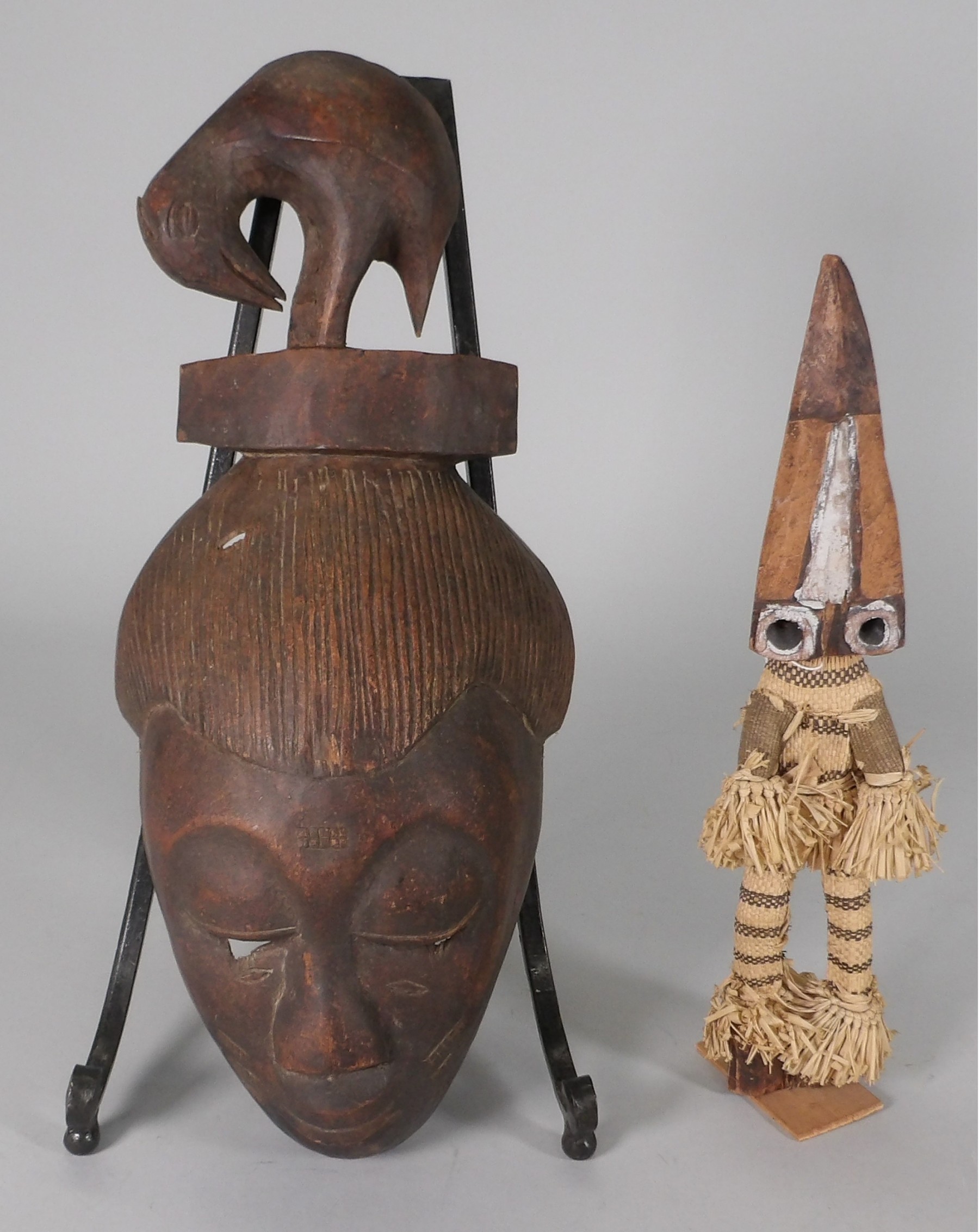 Carved, wood mask depicting a face with a bird on top of the head. There is a small hole in the hair part of the mask. It is 15 1/2" tall.