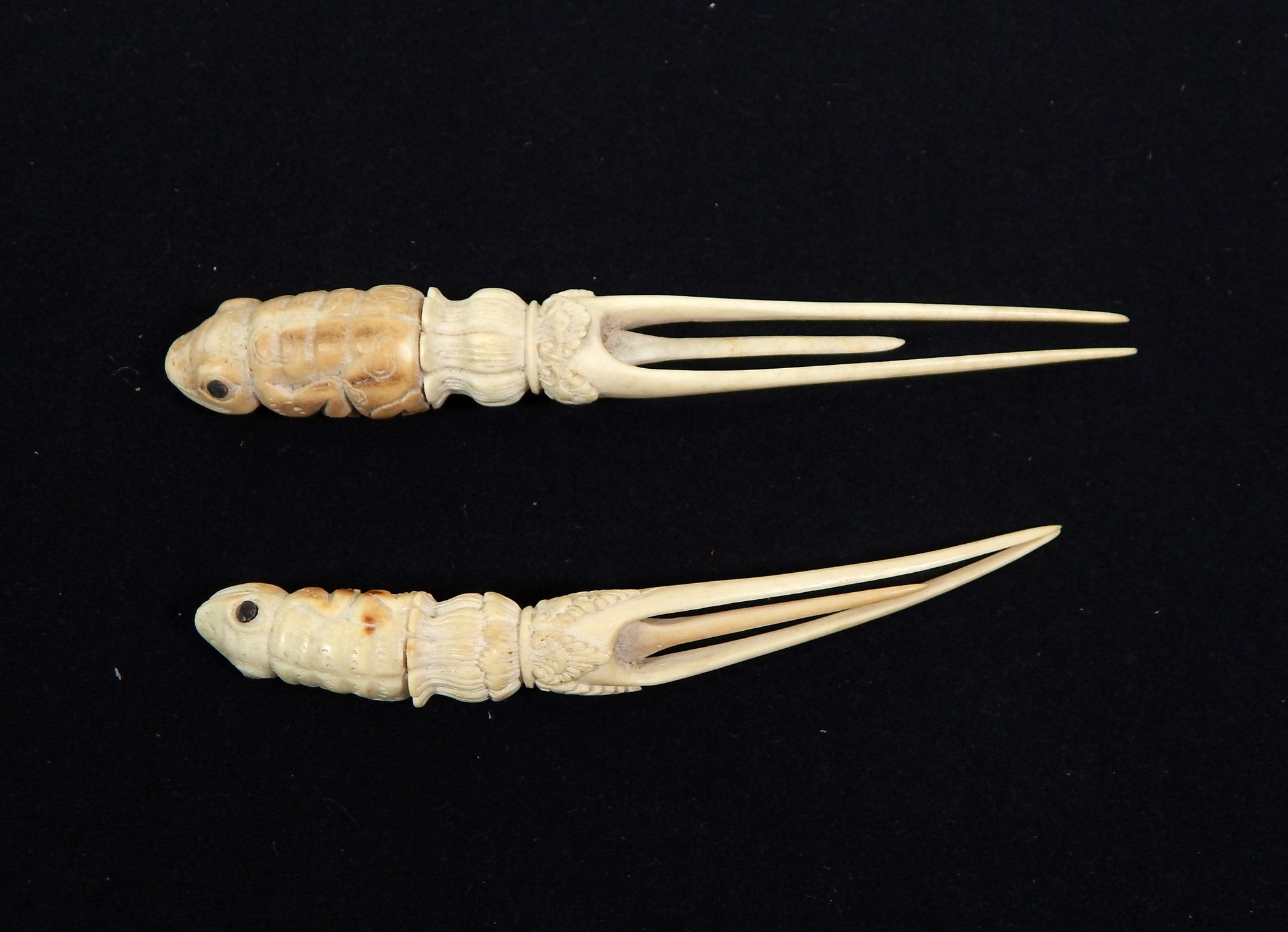 Unusual antique carved bone frog three prong forks or possibly a hair pins.