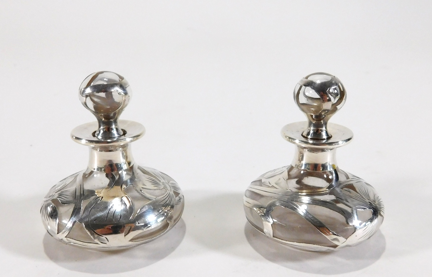 Pair of antique glass perfume bottles with sterling silver overlay.