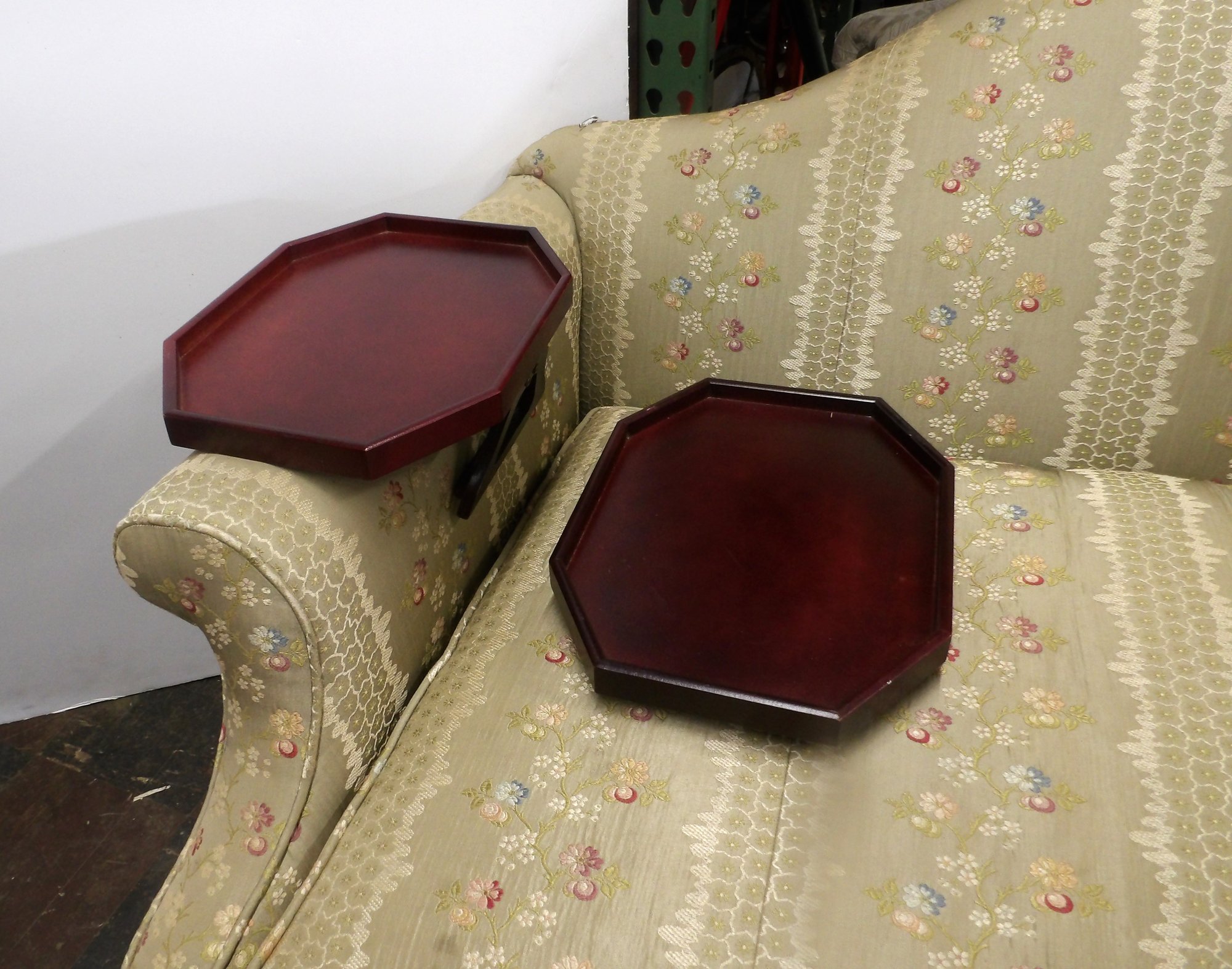 2 small wood table tops that attach to arm of chair or sofa by 2 spring clamps.