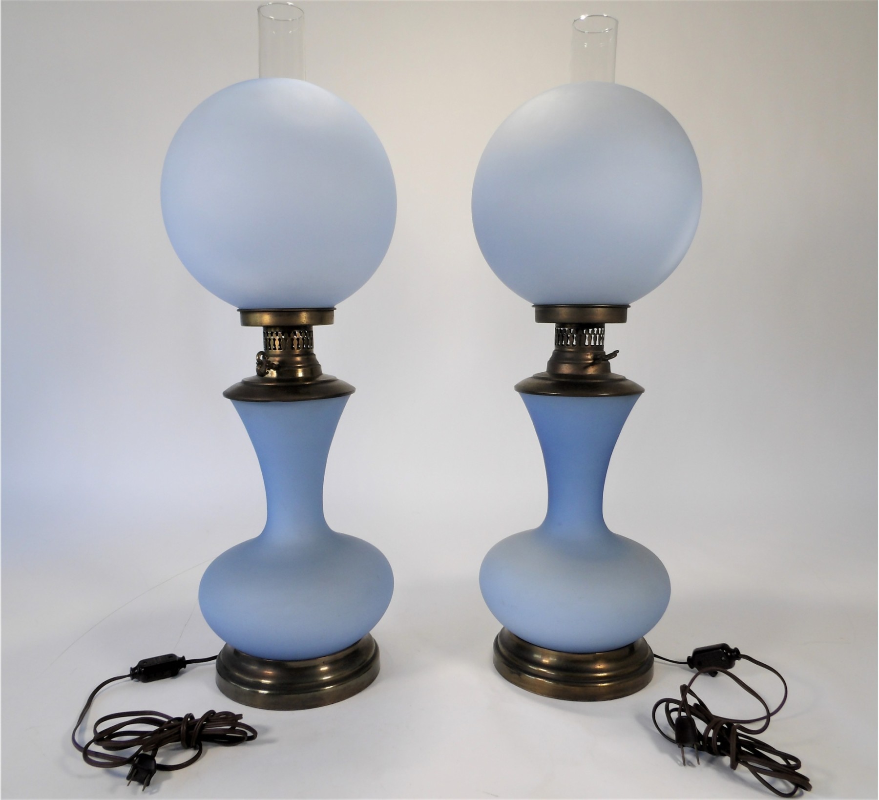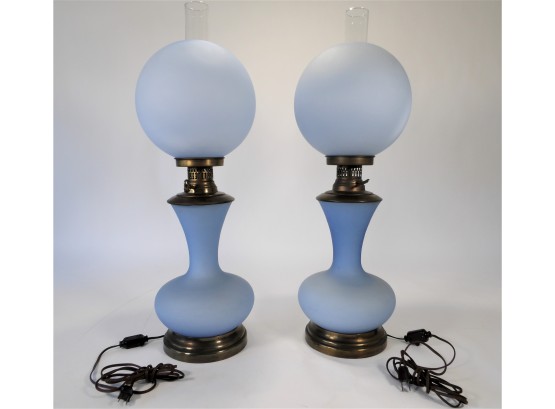 This listing is for 2 blue vintage hurricane lamps. The height is 30", the circumference of the upper globe shade is 31" and the lower base circumference is 29". The structural portion of the lamps is brass and is in good condition. These lamps are in working order with the on/off switch attached to the electrical cord. There seems to be no function to the key and switch on the lamps between the blue glass and 2 of them are loose. There are a few tiny chips on the bottoms of the upper shades but are invisible when placed in the brass fitting. There is one tiny chip on the top edge of one of these shades. Please see photos for additional visual information. Due to the size and delicate nature of these lamps, they are sold with pick-up only.