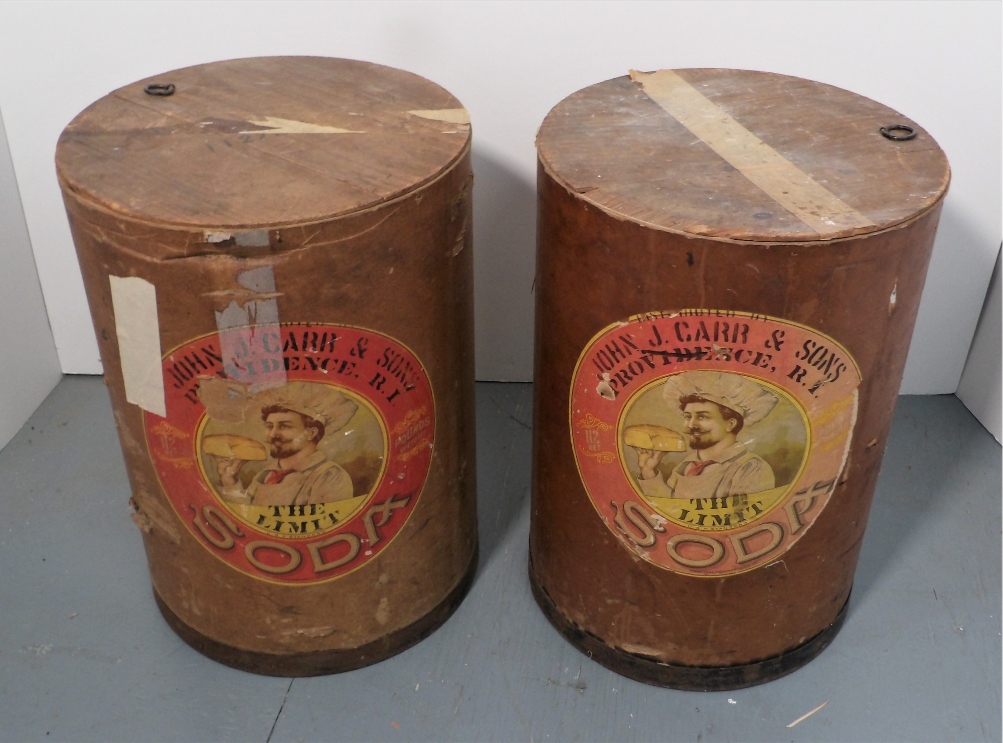 Listed are 2 barrels that once held baking soda from the John J. Carr & Sons Company in Providence, RI that produced wholesale bakery supplies. These barrels measure 20"h x 14.5"diam. The lids can be removed via the metal ring on top and a metal strip secures the barrels on the bottom. The vintage graphics are great and fairly well preserved. Condition is good for their age. See photos for details.
