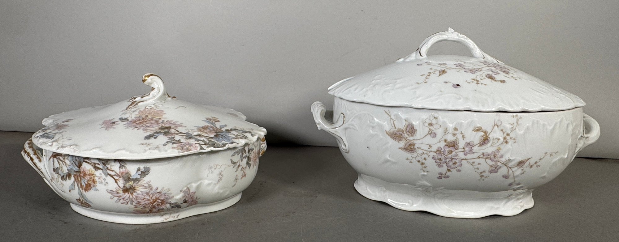 Pair of antique covered serving dishes. Larger dish measures approximately 7.25 x 12.5 inches, smaller dish measures approximately 5 x 7.5 inches.