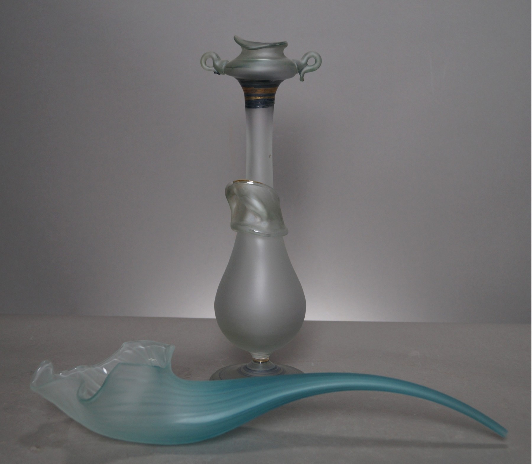 12" tall art glass vase on pedestal. This reminds me of a genie bottle. Frosted glass. No chips or cracks. The fluted vase is signed, and has a chip on the end, as shown. It is 14" long. Maybe for an air plant.