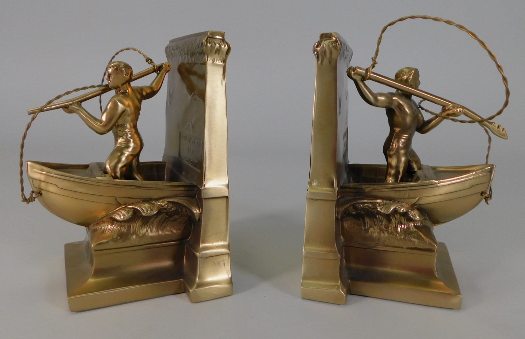 Pair of bookends modeled after The Whaleman statue by Bela Lyon Pratt. They weigh 5 lbs. each. One man's harpoon is broken. On the front, it says, "A dead whale or a stoveboat."