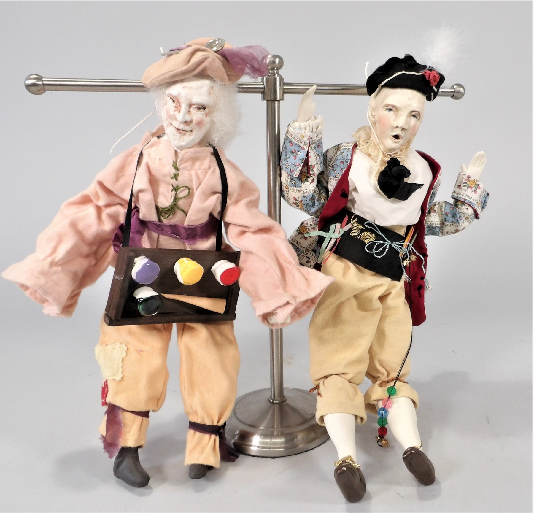 Listed are 2 Francesca porcelain character dolls signed by the artist and measuring 15" tall. Both are solid dome shoulder head dolls with cloth bodies and porcelain lower arms and legs. One is an artist and the other looks to be an opera singer/figure. Condition is very good. See photos for details.