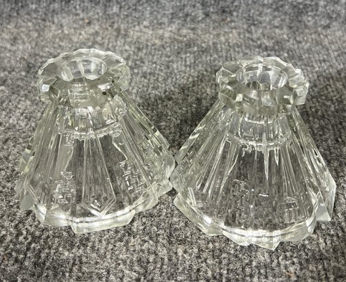 A pair of clear crystal candle holders featuring geometric patterns with precision-cut faceted designs. The holders exhibit symmetrical patterns with step-like ridges around the base, giving them an Art Deco feel.