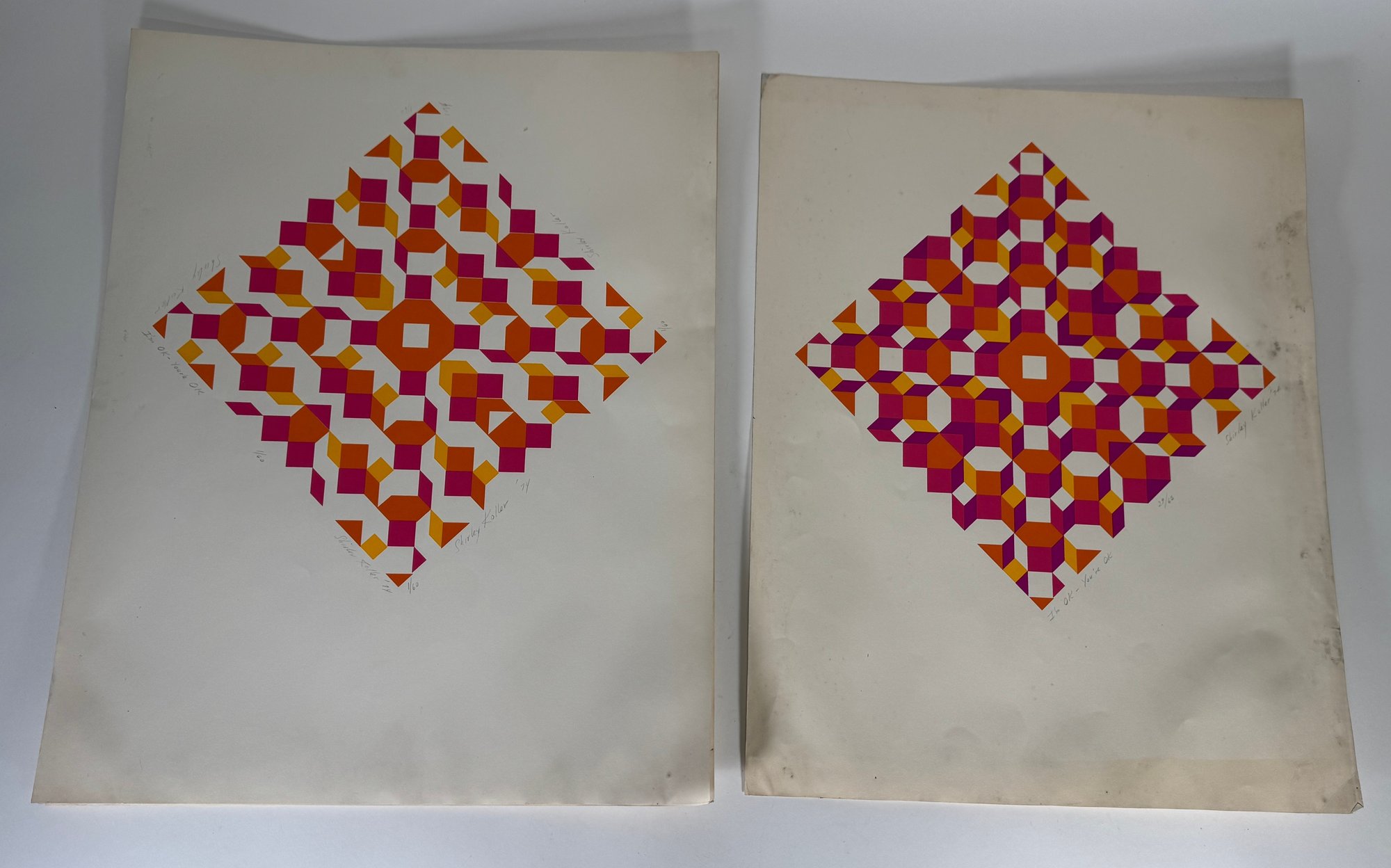 Pair of geometric prints featuring a diamond design. Unframed.