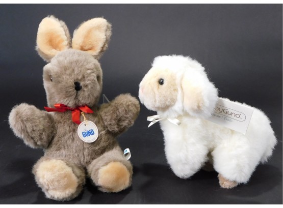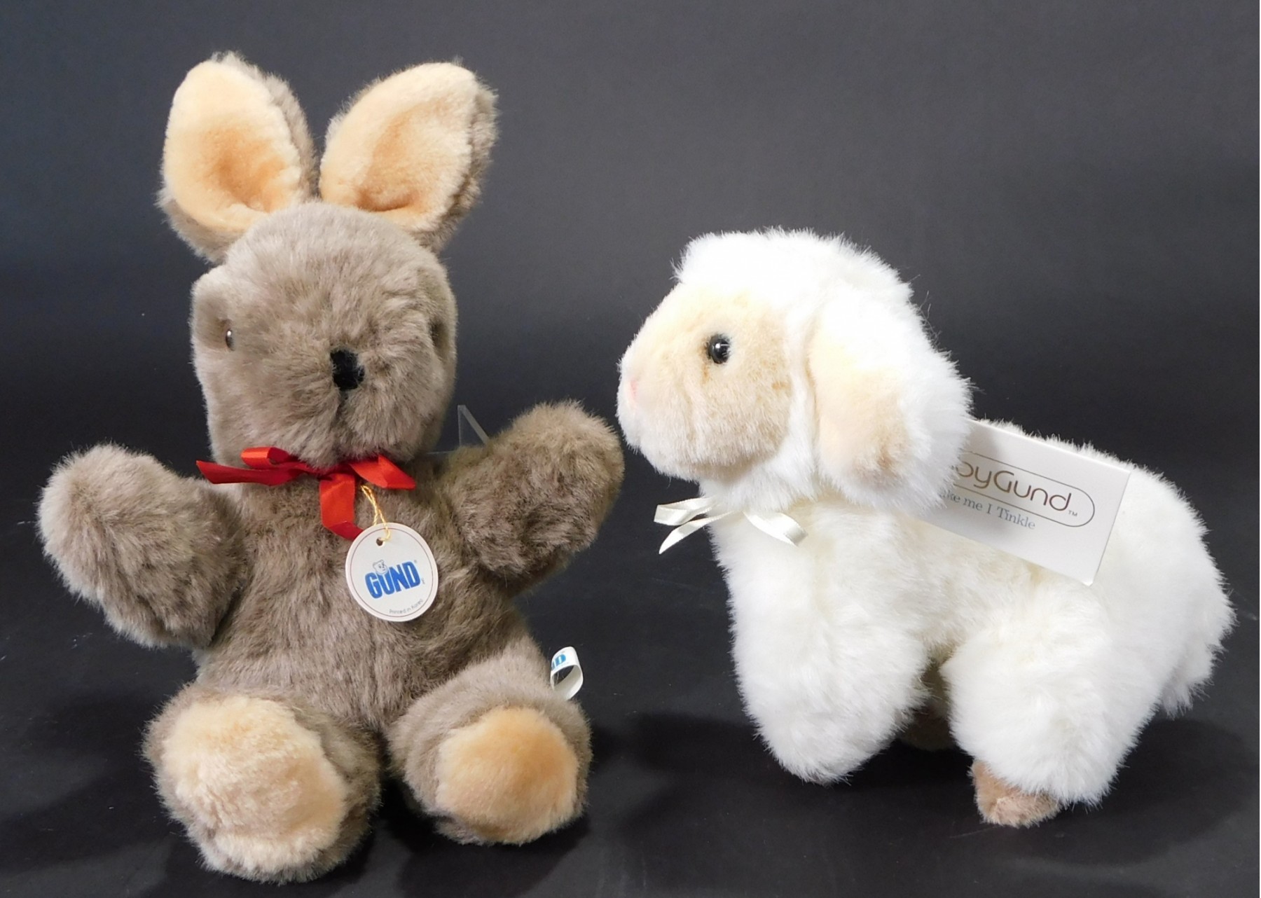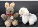 Bunny is 12 inches tall. Lamb is dated 1988. He makes a nice bell sound, if you shake him. Both so cute, and cuddly.