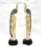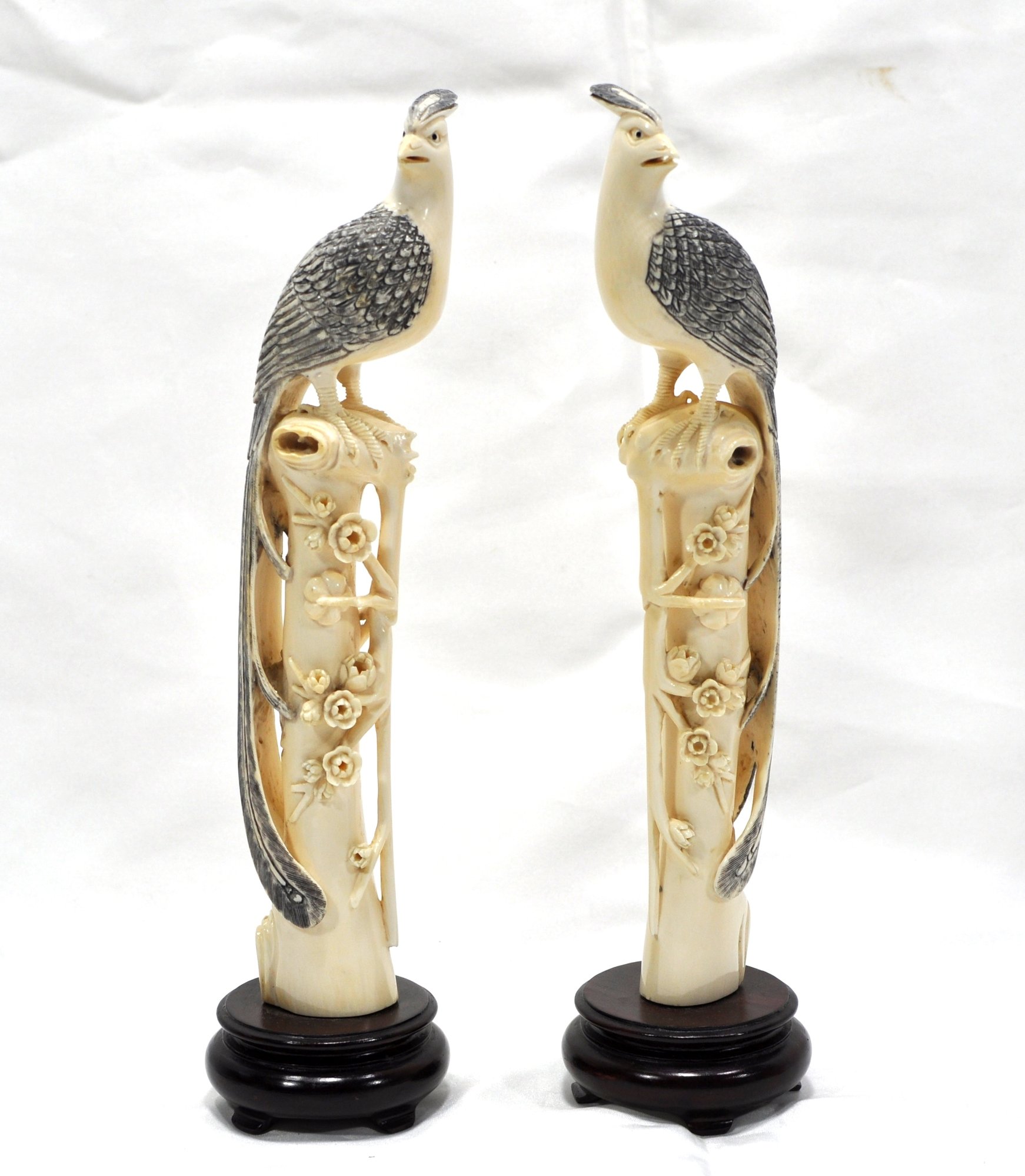 Large and heavy pair of hand carved bone birds on wood stand.