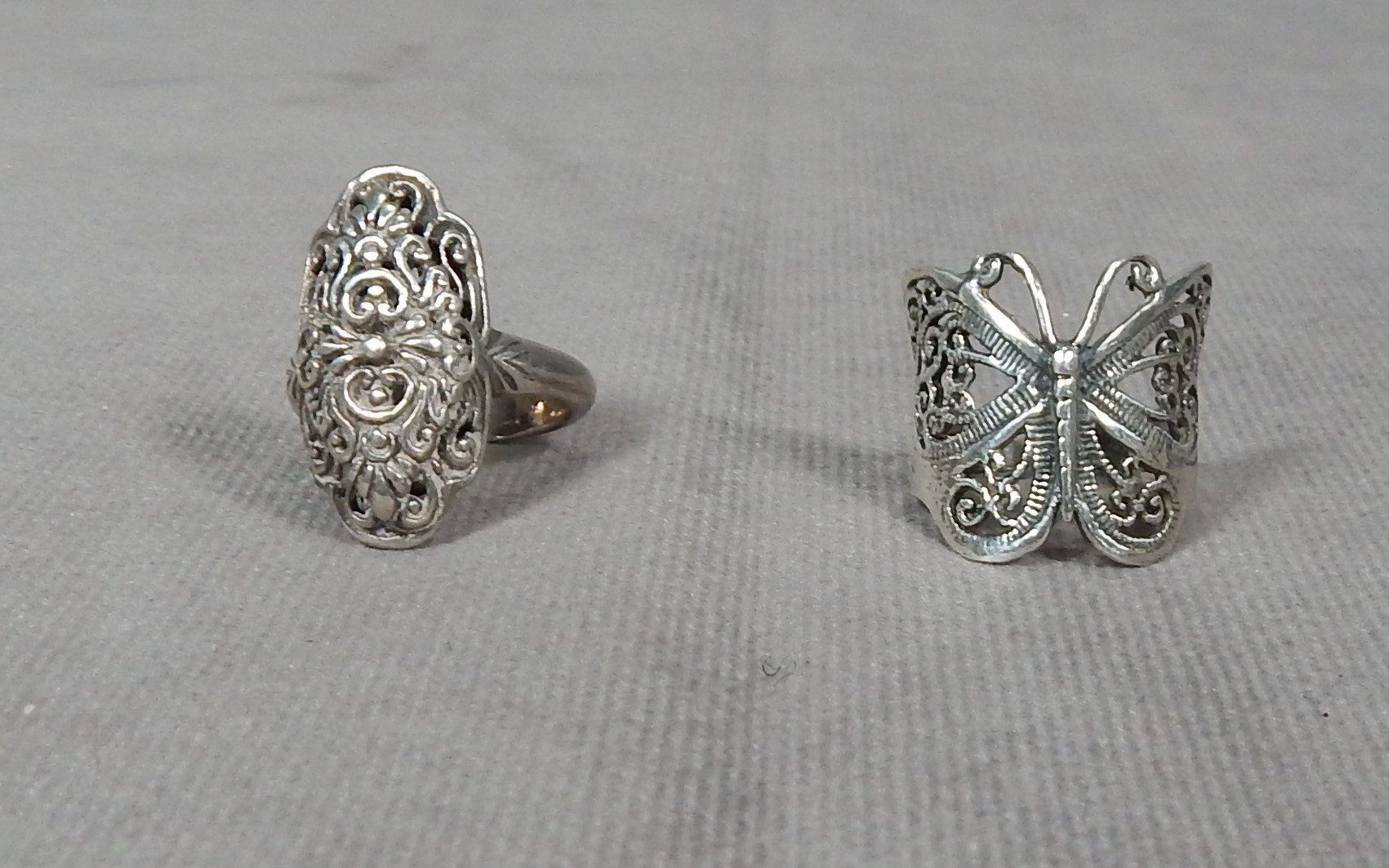The other ring has a nice scroll work pattern. The face of the ring is 1" tall. It is marked 925 THAI. Made in Thailand. It is size 8. Total gram weight of both pieces is 14. Shipping is available.