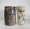 Lot includes two ceramic pieces: a cylindrical vase with a speckled off-white glaze and brown/blue floral design, and a cylindrical crock with a darker brown/grey glaze and blue/black markings. Vase measures approximately 9.75" x 7"; crock measures approximately 9.75" x 5.75". Combined weight is 135.6 oz.
