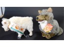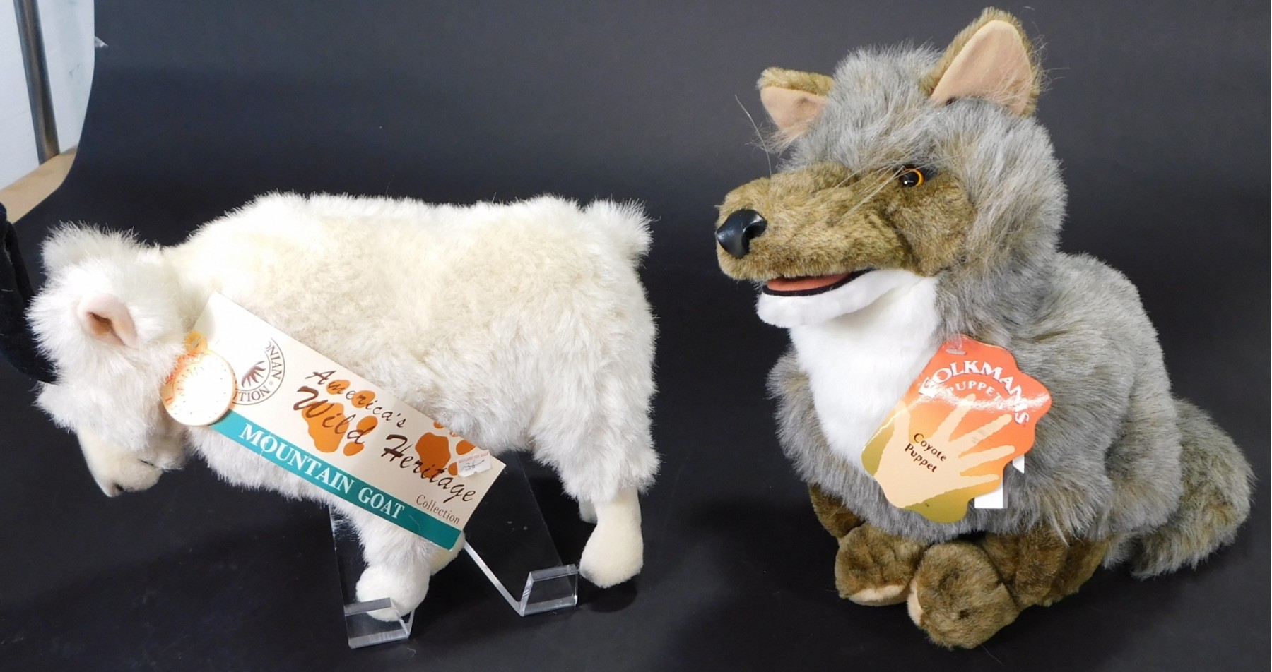 mountain goat is from the Smithsonian Institution. Stands about 10 inches tall. Coyote is a hand puppet, and stands about 13 inches tall. Made by Folkmanis, Inc. Both are very clean.