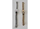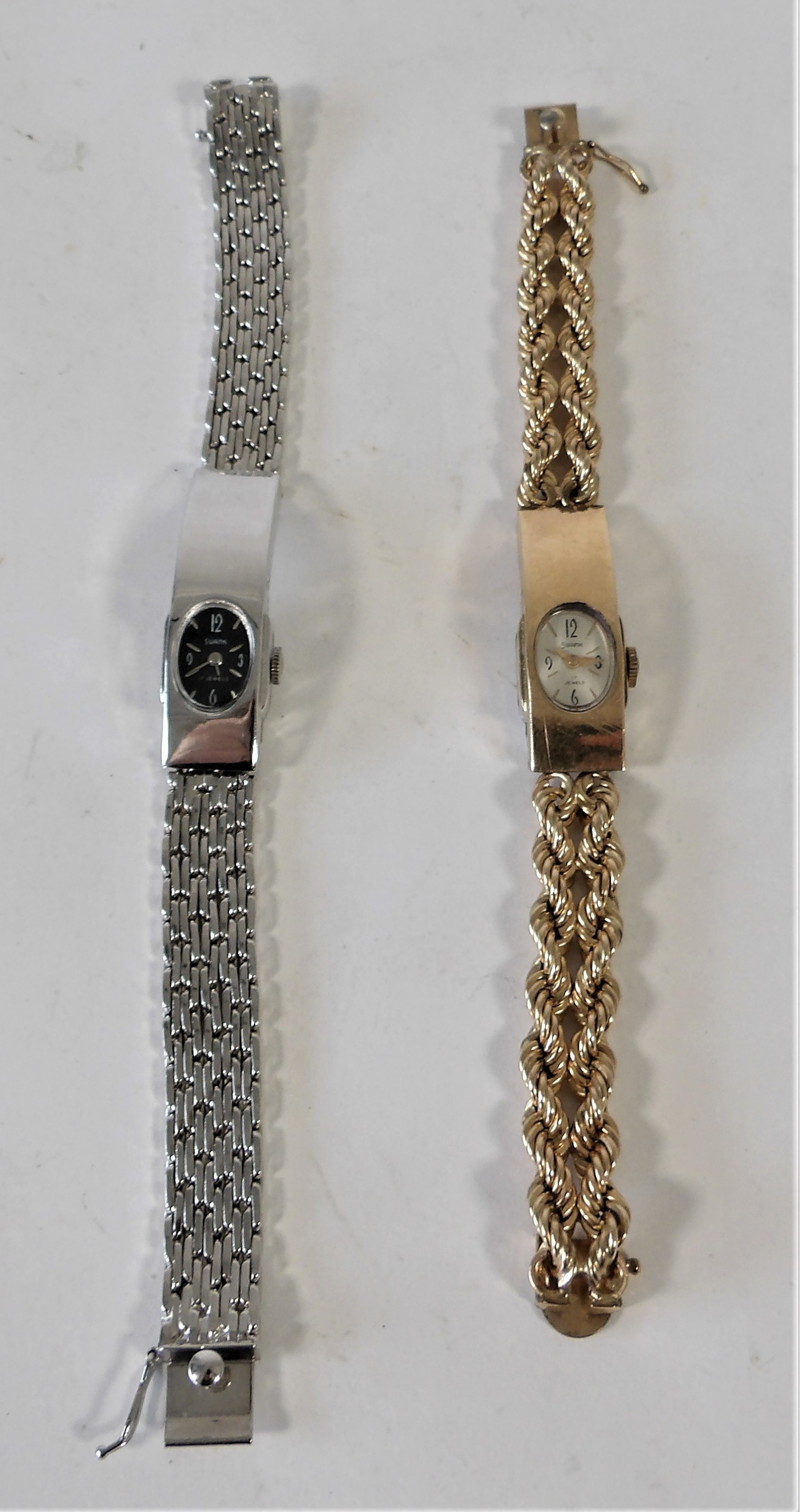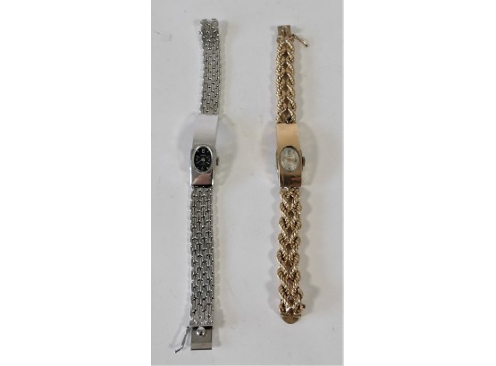 The silver watch has a chain style band. It also has a very secure clasp. Nice pair of watches!