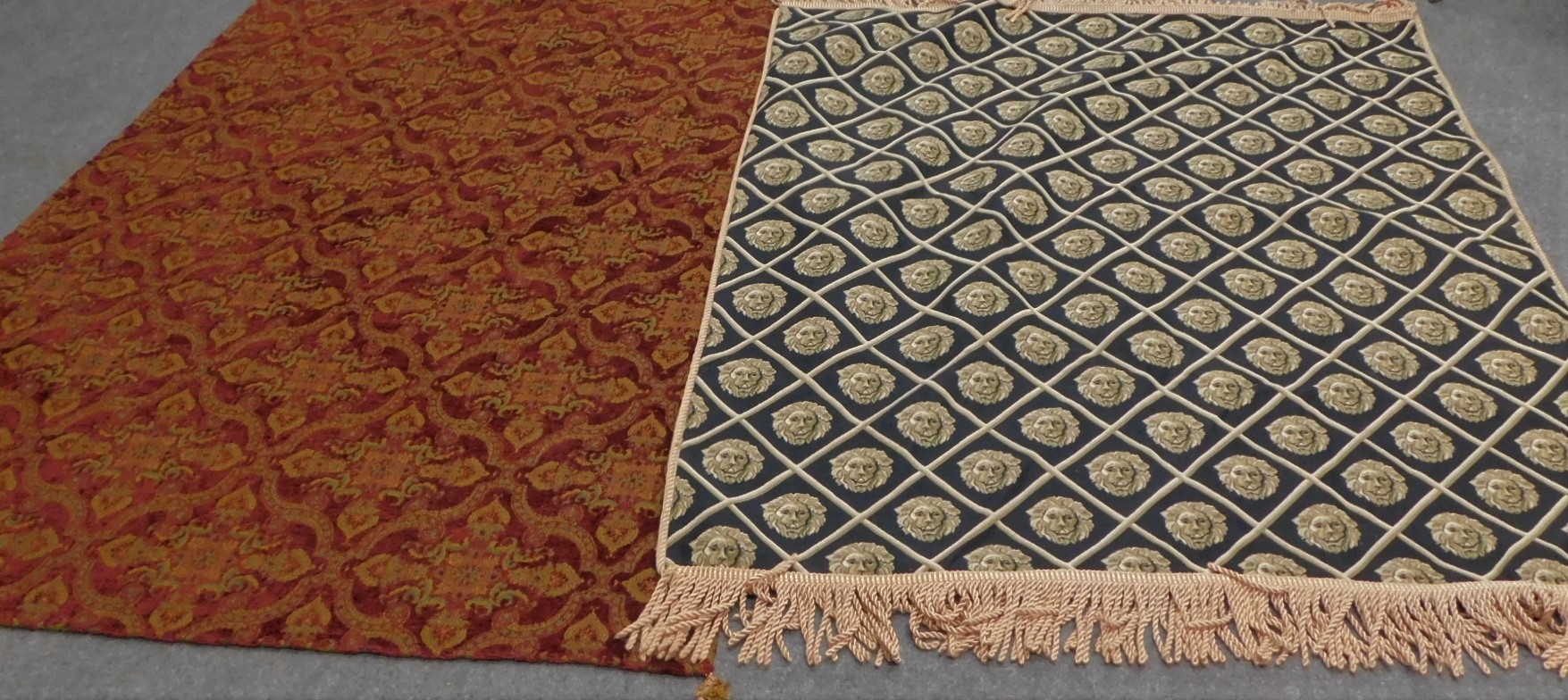 The next piece is 53x60". Black background with lion faces, and gold fringe. The back side is black velvet.
