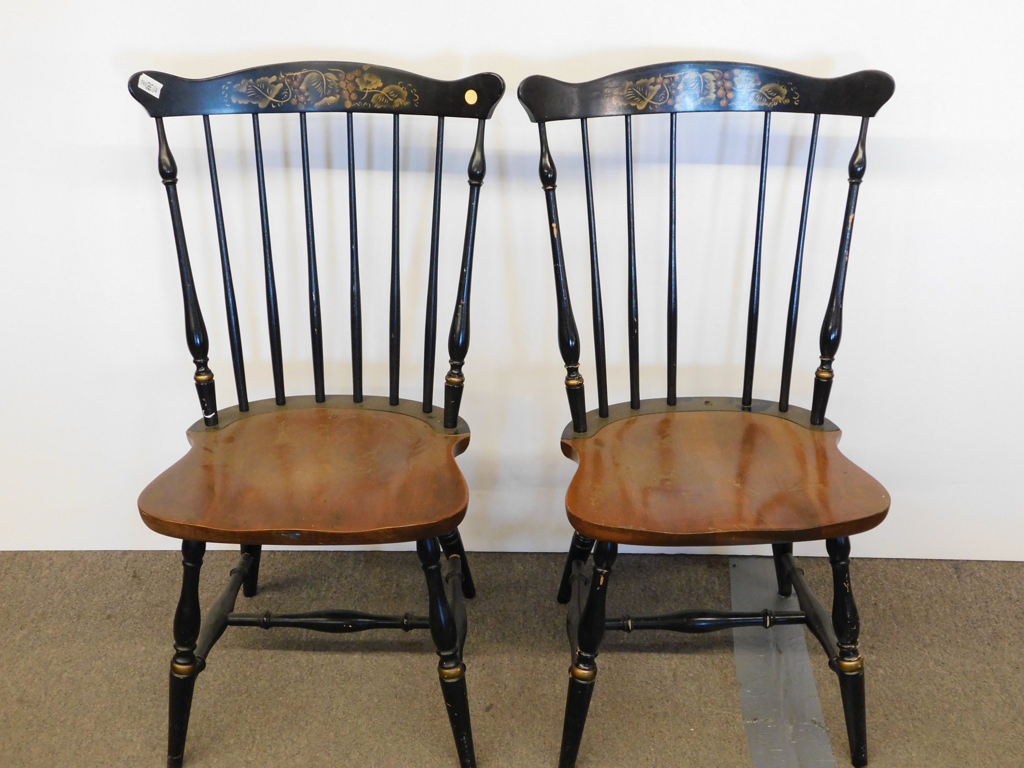 This pair of vintage chairs features a classic Hitchcock-style design with spindle backs, curved top rails, and contoured wooden seats.