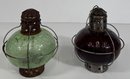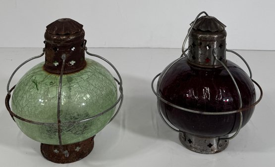 Pair of vintage glass maritime lanterns. One green and one red glass globe, each with metal frames and tops.