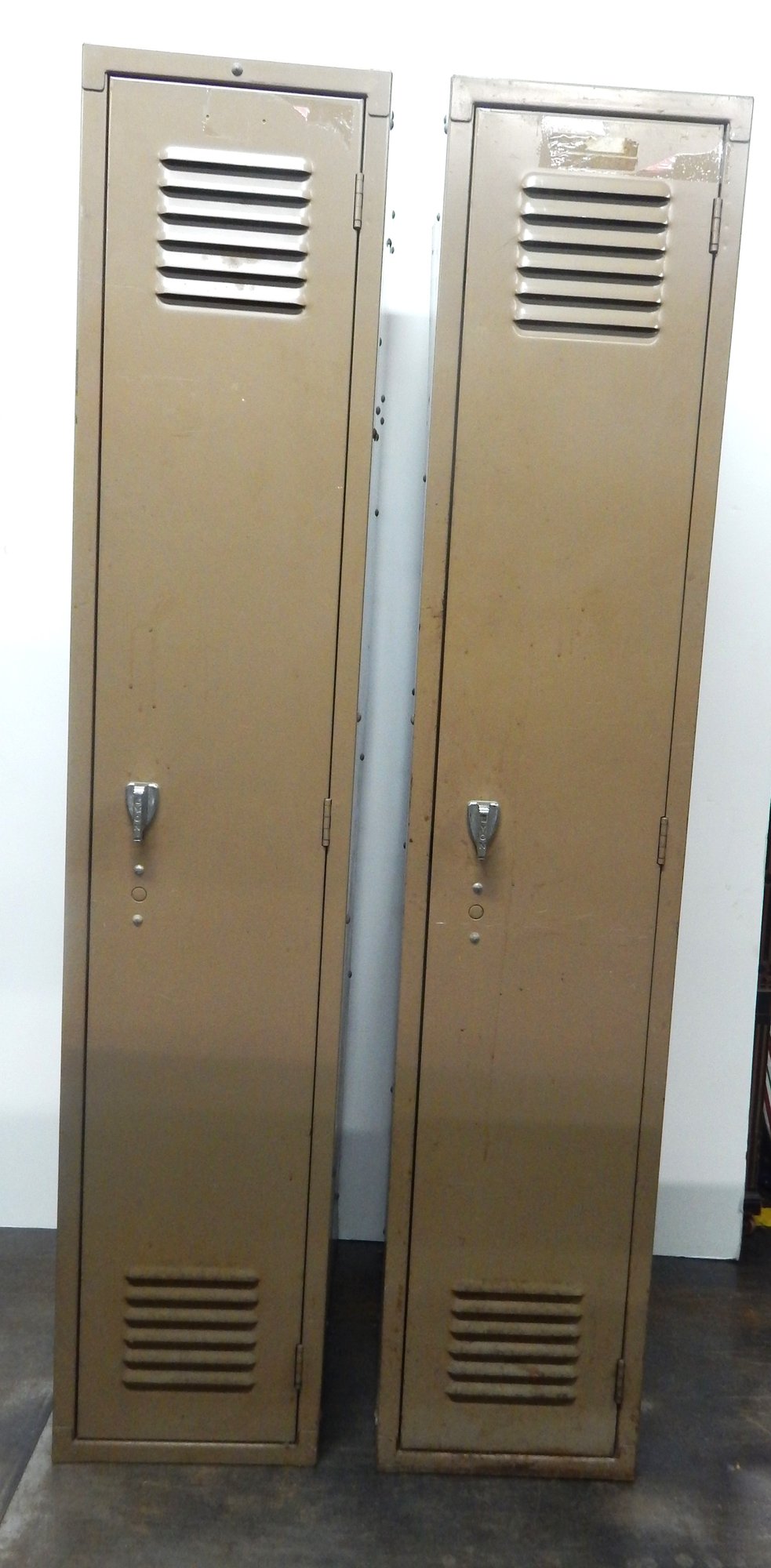 2 metal lockers measuring 12"w x 60"h x 18"d. One locker has a shelf inside, the other does not. Condition is very good, but could use a good cleaning.