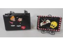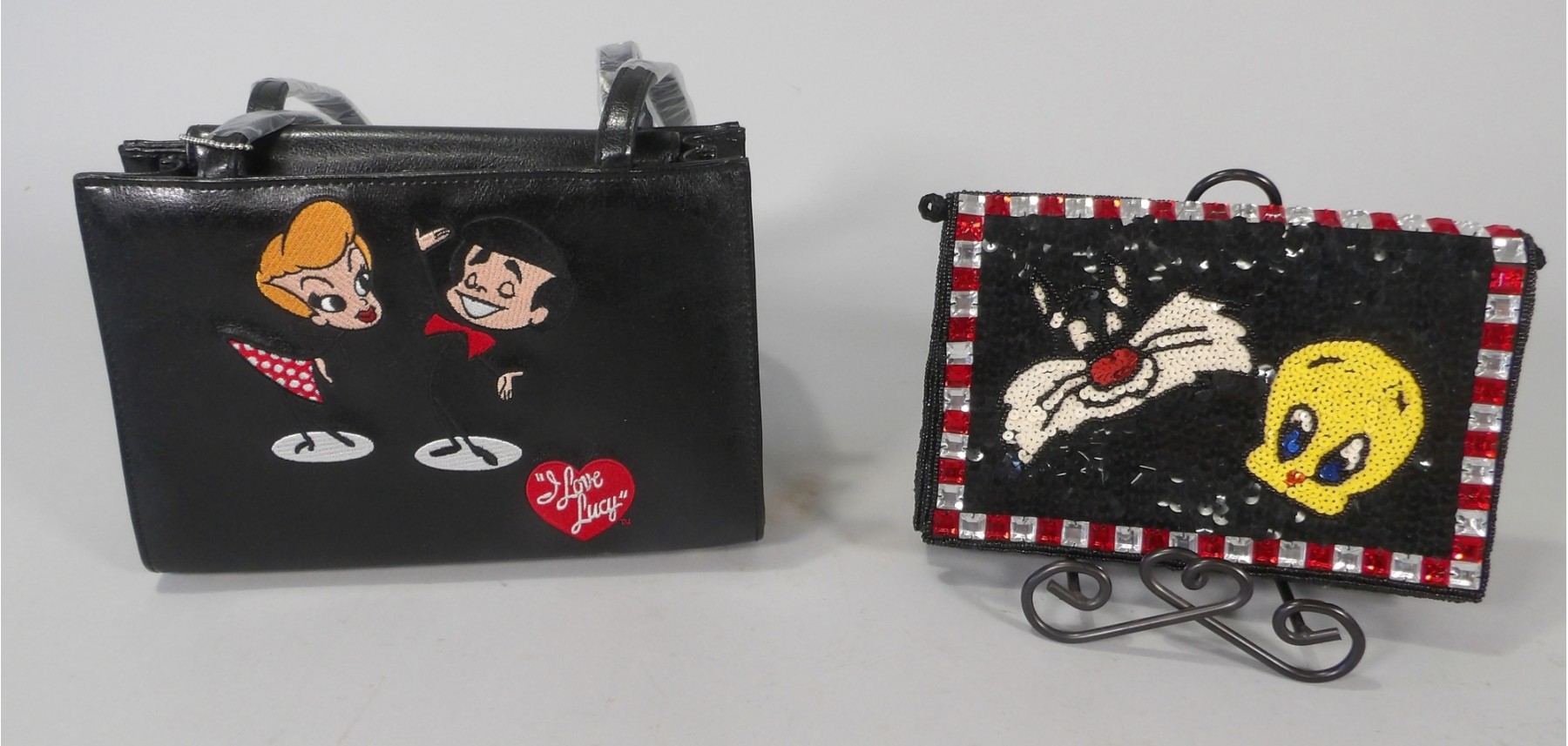 If you love purses, you will love these. Tweety and Sylvester beaded and sequined purse. It measures 8"long x 5 1/2" tall. It has a strap that drops 22". Or you can use it as a clutch. Snap close with 1 side pocket inside.