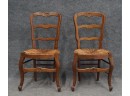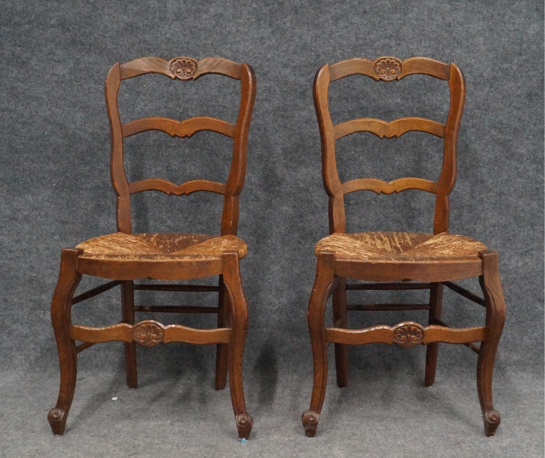 Listed are a pair of oak chairs with original rush seats and carved details. They measure 36"h x 18" to top of seat x 16.25"w x 15.5" d. They are in good vintage condition. See photos.