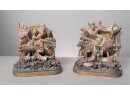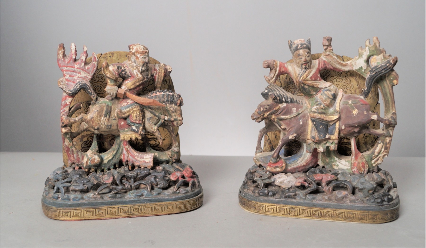 Listed are a unique pair of Asian (Chinese?) bookends featuring warriors on horseback. They measure 6" l x 6" h. The riders are made of plaster and the floral bases and backs are made of metal. The sword of one rider appears to be a replacement, and one has had a hand re-glued. There are condition issues due to age, please see photos for details.